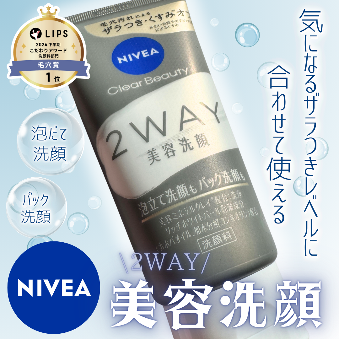 - ※商品名変更(旧名:ニベア クリアビューティー2WAY美容洗顔)に伴い、商品パッケージを順次リニューアル。尚、これにかかる商品の返品・交換は承っておりません。 気になるザラつきレベルに合わせて洗い分け。 毎日の汚れには泡でしっかり。 ザラつき気になる日はパックでごっそり。 古い角質を柔らかくほぐし、汚れを吸着する洗顔料。 毛穴汚れによるザラつき、くすみ*までさっぱり落とします。 透明感のある、毛穴の目立ちにくいつるんとなめらか肌へ。 ●美容ミネラルクレイ配合:タナクラクレイ、カオリン(洗浄) ●リッチホワイトパール保湿成分配合:ホホバオイル、加水分解コンキオリン *古い角質や毛穴の汚れによるくすみ