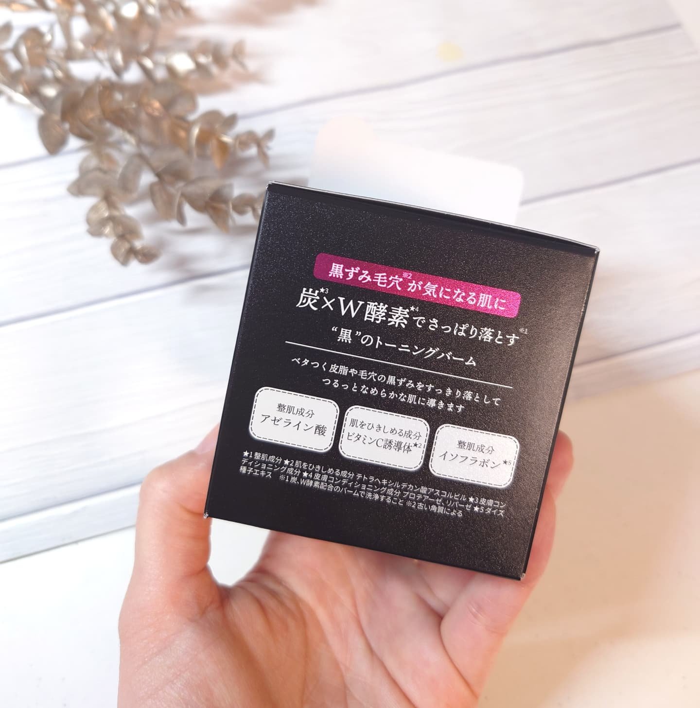 - 炭*1×W酵素*2で、黒ずみ毛穴※1が気になる肌を土台※2から整えるクレンジングトーニングバーム。 炭*1でメイク汚れや皮脂を吸着し、角栓を分解するダブルの酵素の力で古い角質の蓄積汚れまですっきりオフ。※3 さらに皮脂トラブルや角質がたまる仕組みに着目し、アゼライン酸*3やビタミンC*4などを配合。毛穴の目立ちにくい、つるっとなめらかな素肌へ整えます。 厚みのあるバームが肌への摩擦を軽減。肌へやわらかく密着し、メイク汚れを包み込んで洗い流します。 乳化スピードがUP※4してすすぎやすく、洗い残しを防ぎます。 (※1 古い角質による ※2 角質層のこと ※3 炭、W酵素配合のバームで洗浄すること ※4 当社従来品比 *1 皮膚コンディショニング成分 *2 皮膚コンディショニング成分 プロテアーゼ、リパーゼ *3 整肌成分 *4 肌をひきしめる成分 テトラヘキシルデカン酸アスコルビル)