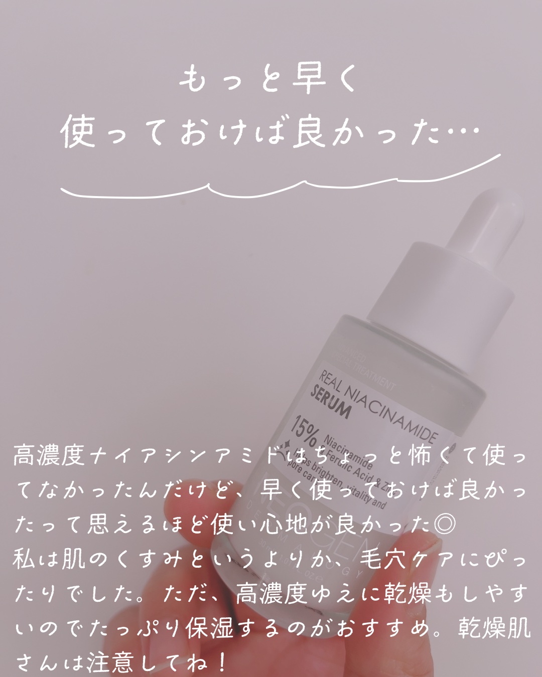 ナイアシンアミド15%配合され、肌トーンを均一に整えて、乾燥による毛穴の広がりや過剰皮脂を抑制し、なめらかでくすみのないお肌に導いてくれる! 白色で少しとろみのあるテクスチャーで、お肌に吸収されるとしっとりしてもっちり肌にしてくれる! 低刺激テスト済みで刺激を感じることなく使えたよ。また、油分が配合され保湿力もあるので乾燥肌の方でも使いやすい。