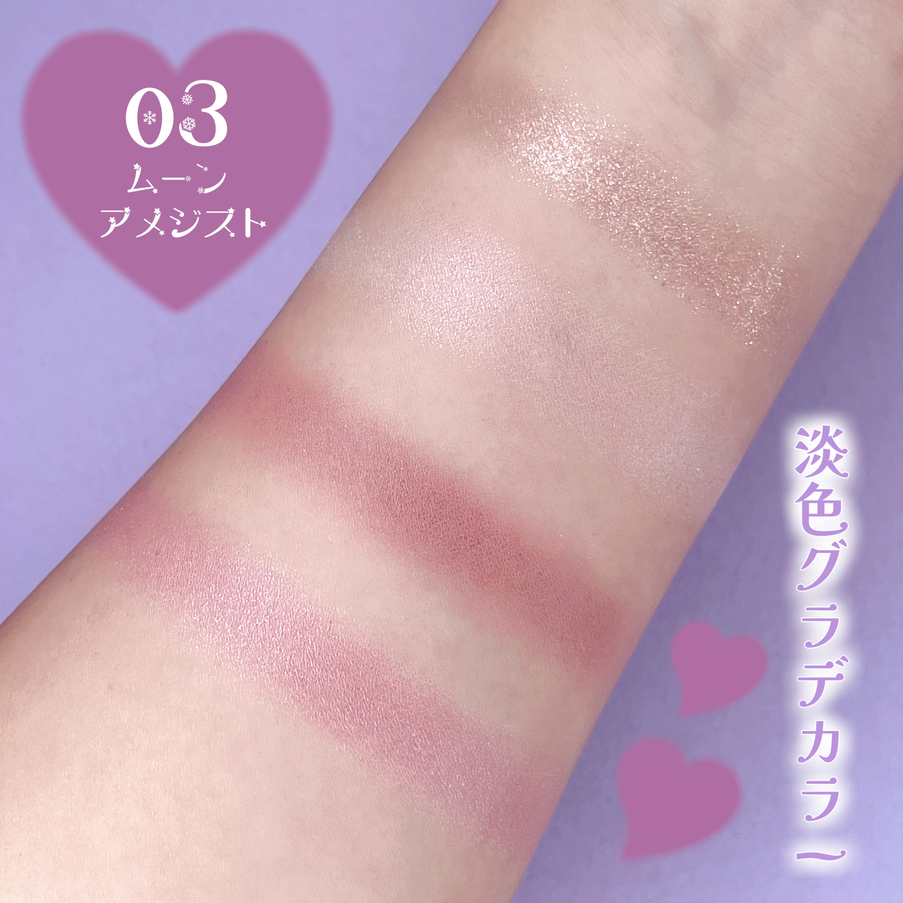 明るい目元に仕上がるまろやかなペールカラーの4色アイシャドウ❤︎ ラメ・パール・マットの3質感を重ねて、透明感のあるクリッとした目元へ。 儚げに煌めくヌーディなラベンダー。透け感があってほんのり色気をプラス🪻 紫好きさん待望のラベンダーアイシャドウがでたよー!!透け感と繊細ラメが天才すぎる❤︎