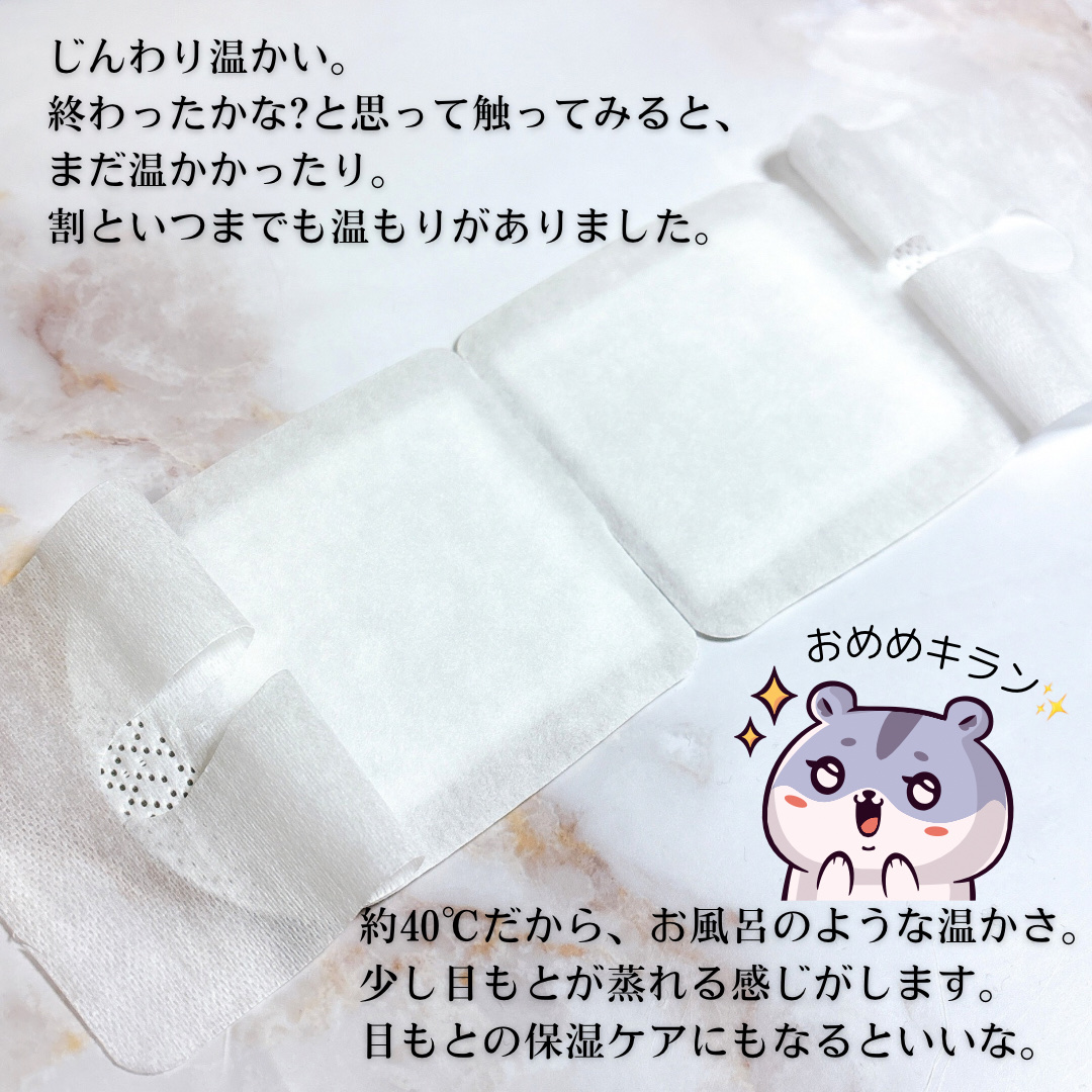 - 働き続けた目をあったか蒸気で包み込むアイマスク。 心地よい蒸気が目と目もとを温かく包み込み、はりつめた気分をほぐします。まるでお風呂のような心地よさ。快適時間約20分。 無香料。