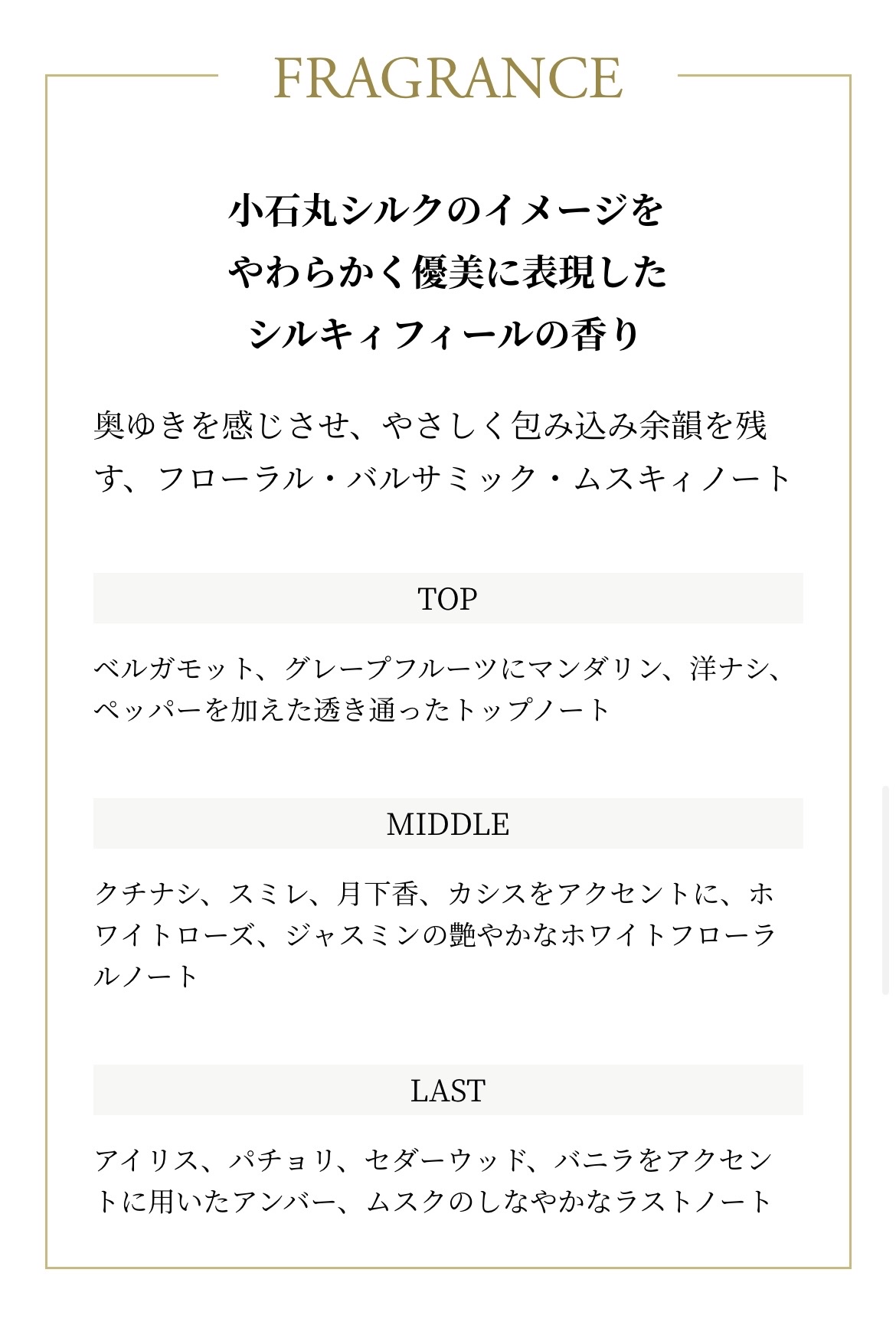 トップはかなり「ウッディ」って感じる、、公式でトップノートにパインニードルオイルの記載があるのを見て超納得。まさに松っていう感じで重過ぎないけどずしっとした香りでこれまで持ってないタイプだったのでまずそこがお気に入り ミドルで言うとコケかな。でも数時間してくるとだんだんムスクが顔を出してきて、甘くなり始める ラストはもう本当、待ってました!って感じのしっかりと甘さのある香り。ウッディが消えないまま甘さが立ち上がってくるような、まったりとしつつもべっとりはしない甘い香り