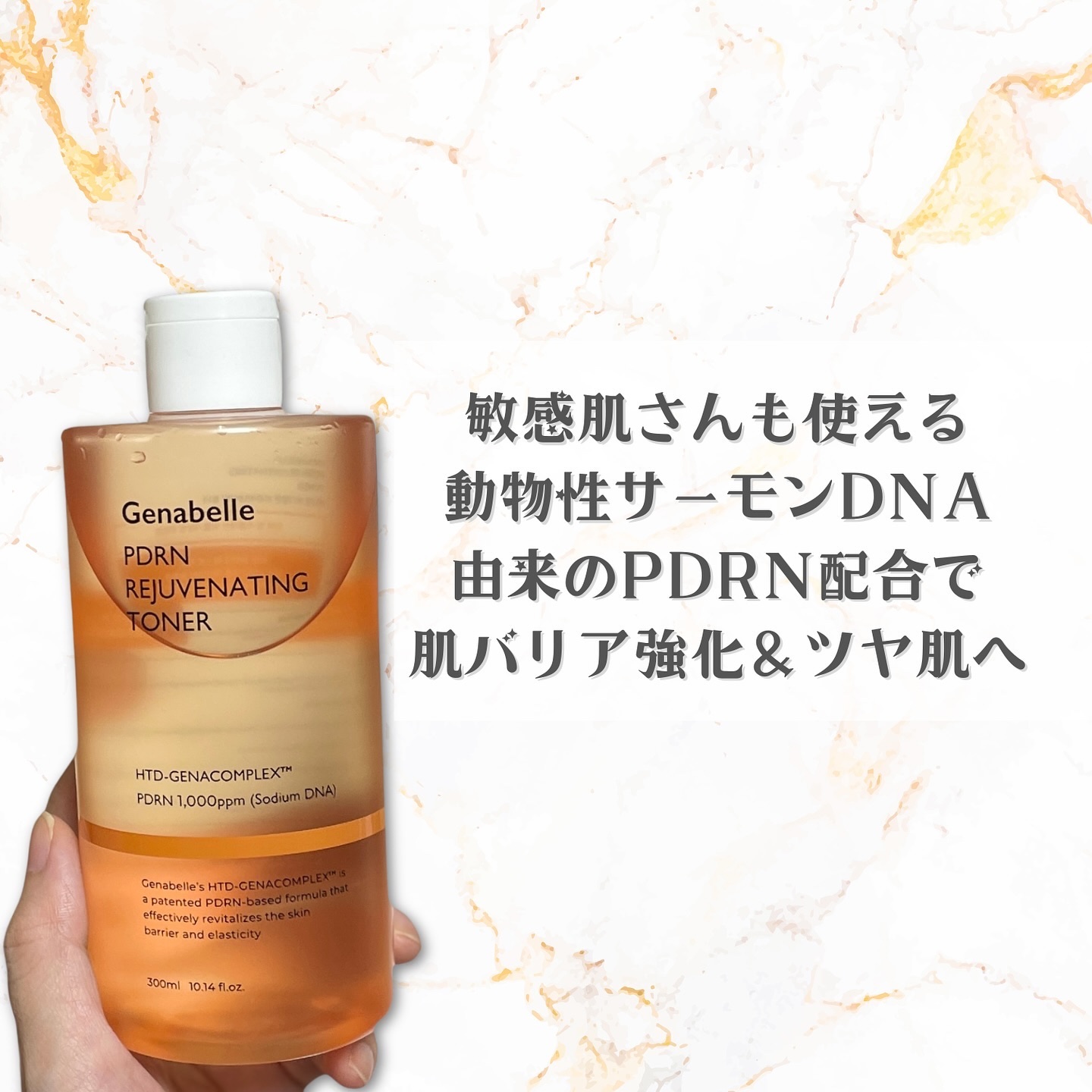 最近とても話題な美容成分、「PDRN」。私の大好きな韓国スキンケアブランド<Genabelle>からも、そんなPDRNを配合したコスメがたくさん出ています🥰 お肌のバリアを強化し、ツヤ肌を叶えるサーモンDNA由来のPDRNが配合されています。植物性ではなく動物性のPDRNを使用した、皮膚再生大容量トナーになっています😲✨ なめらかで伸びが良く、使い心地の良いテクスチャー。ベタつかないのにしっとり感が感じられ、キメも整い、毎日のスキンケアに取り入れていきたいトナーです🥰