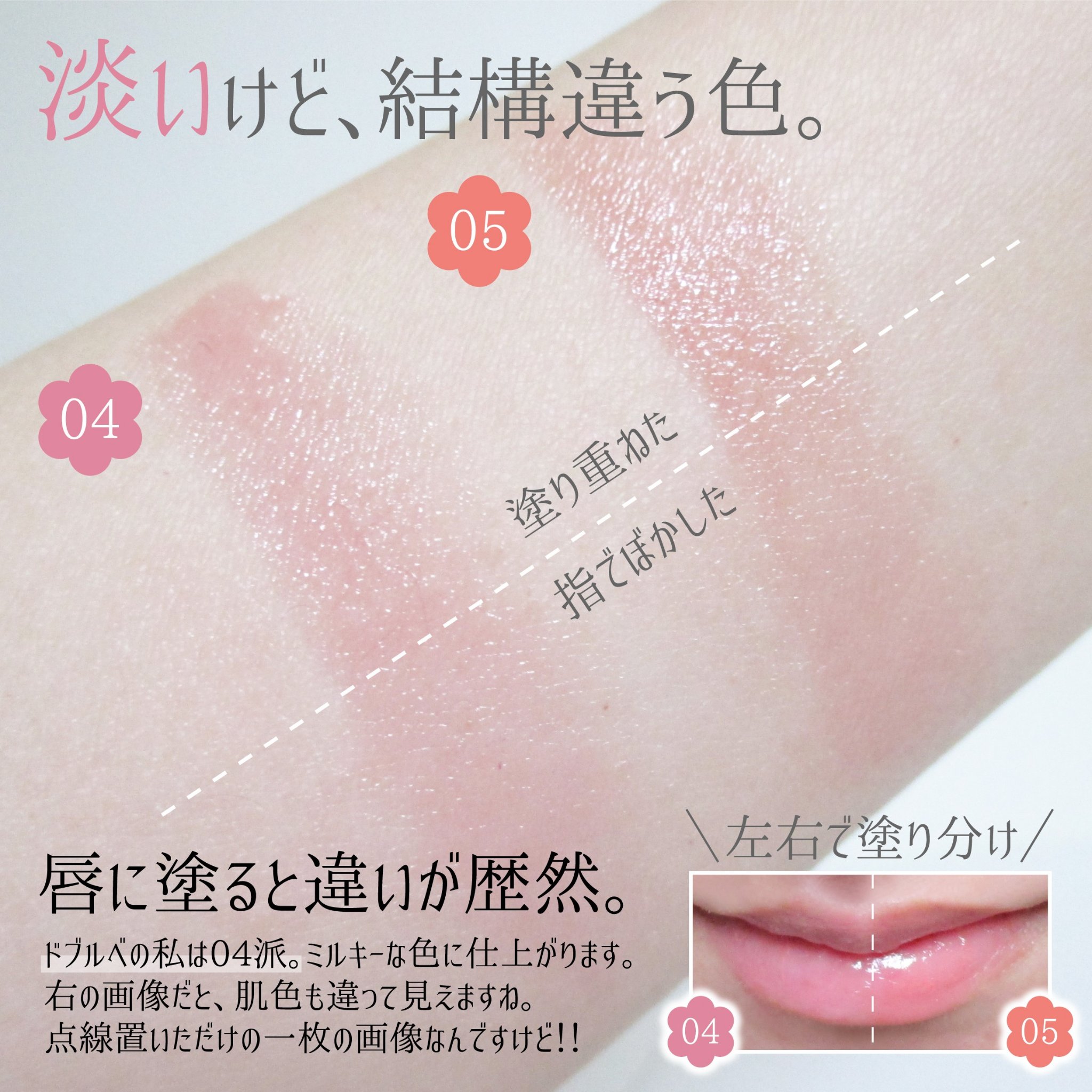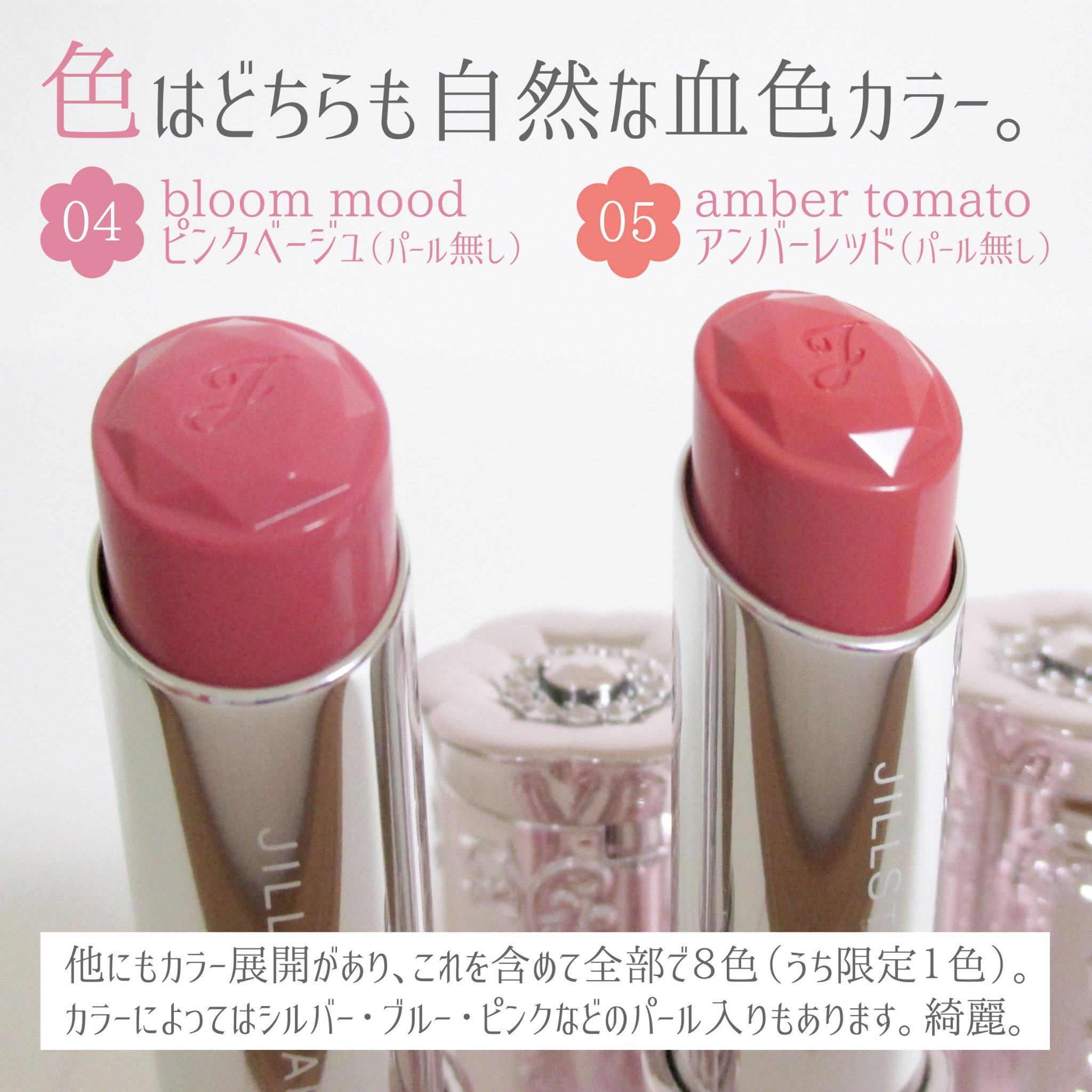 少しスースーした清涼感があって、つけるとツヤがでてほんのり血色感のある唇になるよ♡ パケが可愛くてキャップの上はミラーになってる🌸 ジルスチュアート リップブロッサム バーム 04 bloom mood 05 amber tomato