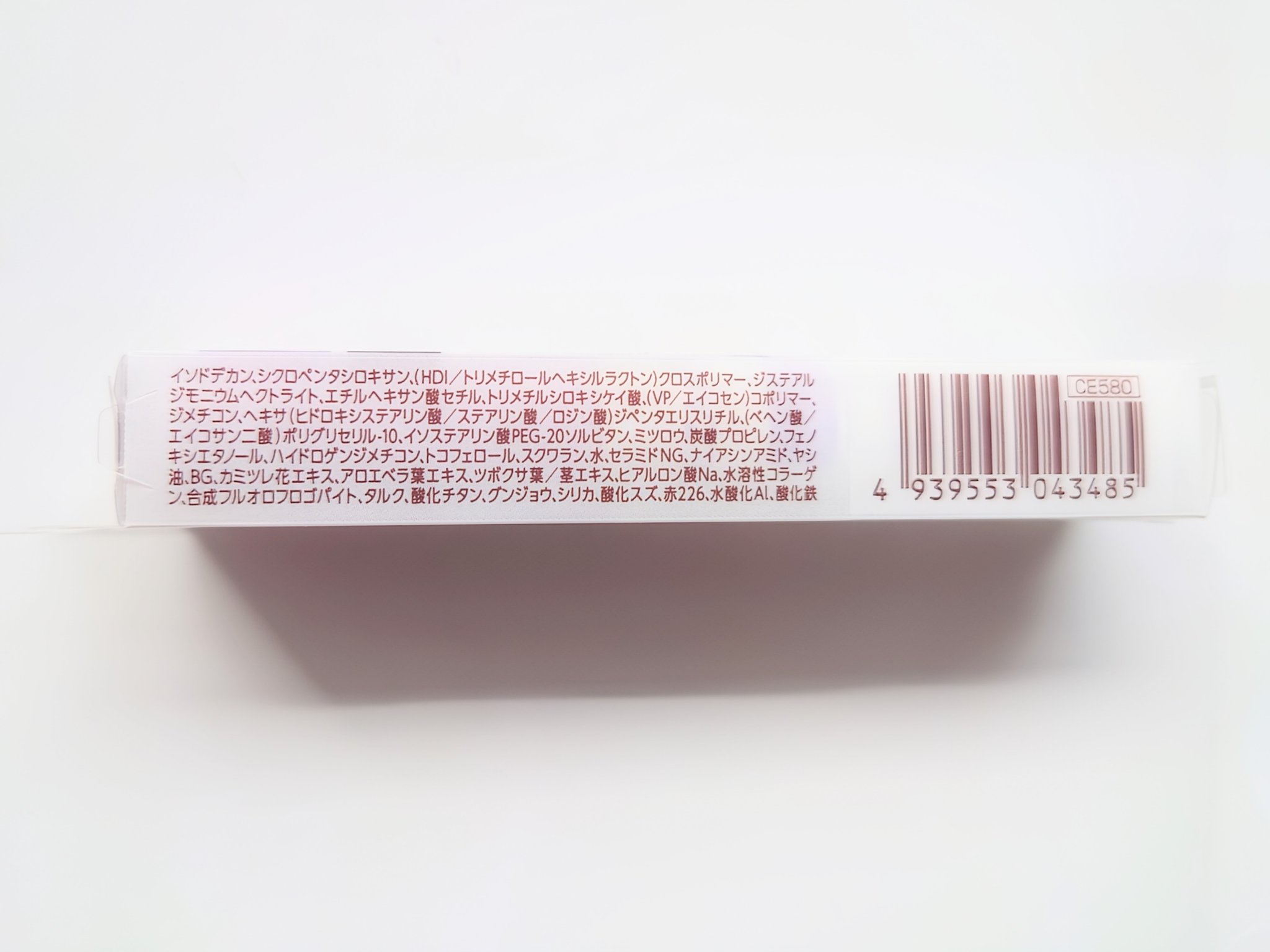 - <アイメイクベース クリア> イソドデカン、シクロペンタシロキサン、(HDI/トリメチロールヘキシルラクトン)クロスポリマー、ジステアルジモニウムヘクトライト、エチルヘキサン酸セチル、トリメチルシロキシケイ酸、(VP/エイコセン)コポリマー、ジメチコン、ヘキサ(ヒドロキシステアリン酸/ステアリン酸/ロジン酸)ジペンタエリスリチル、(ベヘン酸/エイコサン二酸)ポリグリセリルー10、イソステアリン酸PEGー20ソルビタン、ミツロウ、炭酸プロピレン、フェノキシエタノール、ハイドロゲンジメチコン、トコフェロール、スクワラン、水、セラミドNG、ナイアシンアミド、ヤシ油、BG、カミツレ花エキス、アロエベラ葉エキス、ツボクサ葉/茎エキス、ヒアルロン酸Na、水溶性コラーゲン、タルク、合成フルオロフロゴパイト、酸化チタン、シリカ、水酸化Al <アイメイクベース> イソドデカン、シクロペンタシロキサン、(HDI/トリメチロールヘキシルラクトン)クロスポリマー、ジステアルジモニウムヘクトライト、エチルヘキサン酸セチル、トリメチルシロキシケイ酸、(VP/エイコセン)コポリマー、ジメチコン、ヘキサ(ヒドロキシステアリン酸/ステアリン酸/ロジン酸)ジペンタエリスリチル、(ベヘン酸/エイコサン二酸)ポリグリセリルー10、イソステアリン酸PEGー20ソルビタン、ミツロウ、炭酸プロピレン、フェノキシエタノール、ハイドロゲンジメチコン、トコフェロール、スクワラン、水、セラミドNG、ナイアシンアミド、ヤシ油、BG、カミツレ花エキス、アロエベラ葉エキス、ツボクサ葉/茎エキス、ヒアルロン酸Na、水溶性コラーゲン、合成フルオロフロゴパイト、タルク、酸化チタン、グンジョウ、シリカ、酸化スズ、赤226、水酸化Al、酸化鉄