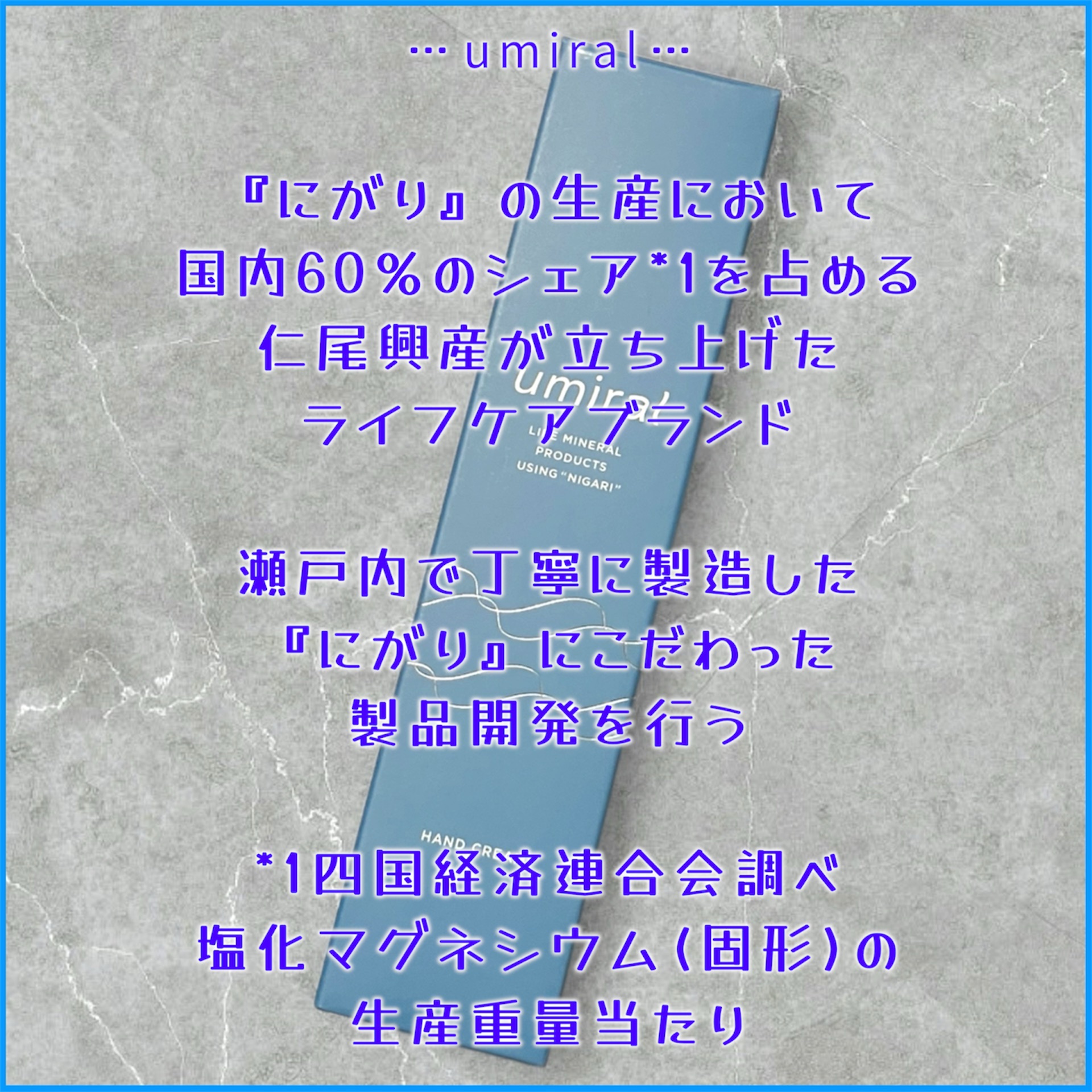 umiral(ウミラル)umiralバスソルト350g。塩化マグネシウム(にがり)を使用したバスソルトです。海の恵み、ミネラルが豊富。海水からつくられる自然由来成分。塩化マグネシウムを主成分とした、豆腐の凝固剤として利用される食品添加物。無香...
