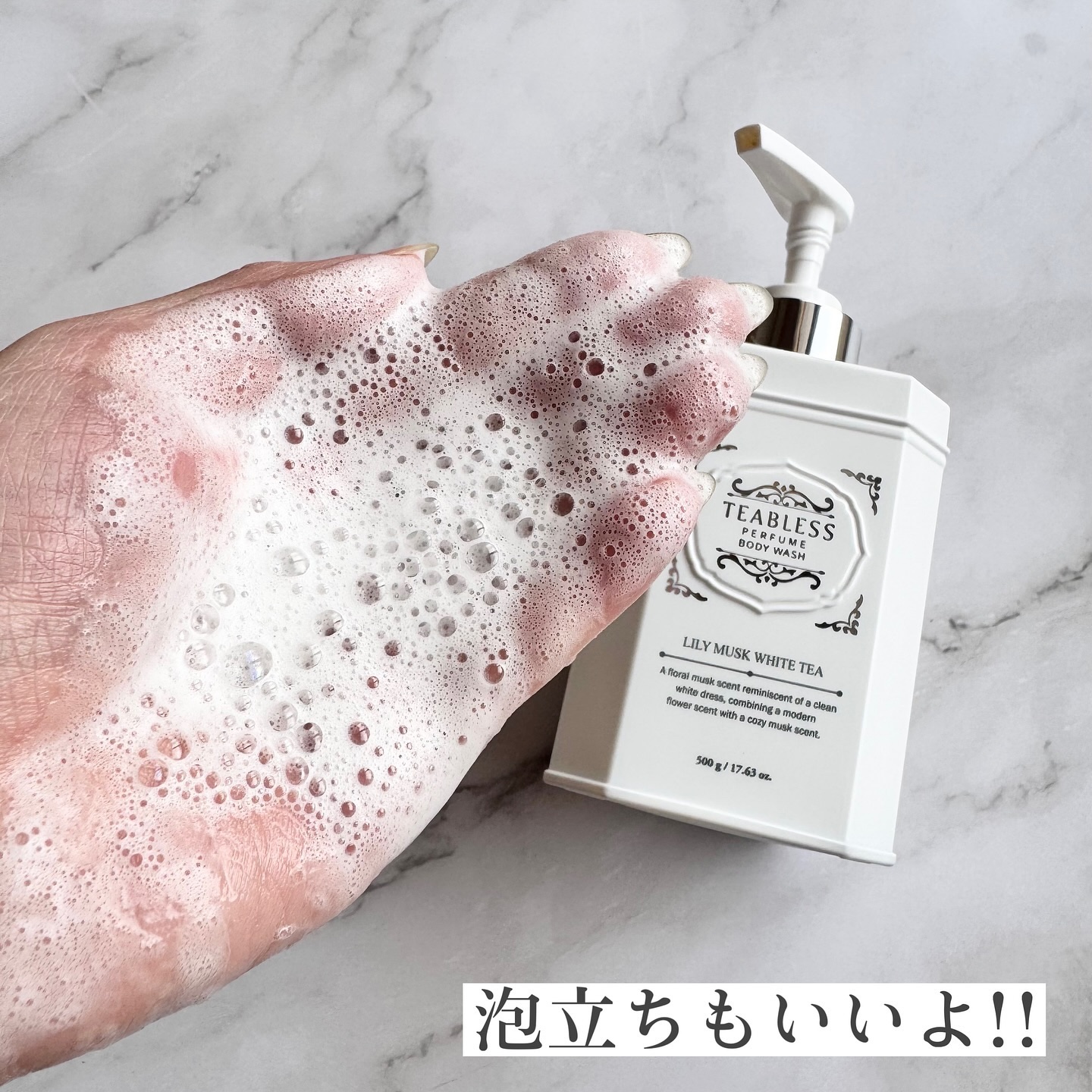 TEABLESS・パフュームボディウォッシュリリームスクホワイトティー繊細な白茶の香りとムスクのやさしさが広がる、癒しの香り茶の原料「緑茶葉」と白茶エキスの抗酸化効果により、洗浄後に潤いを残したままマイルドなスクラブ効果を与えるそうパケが紅茶...