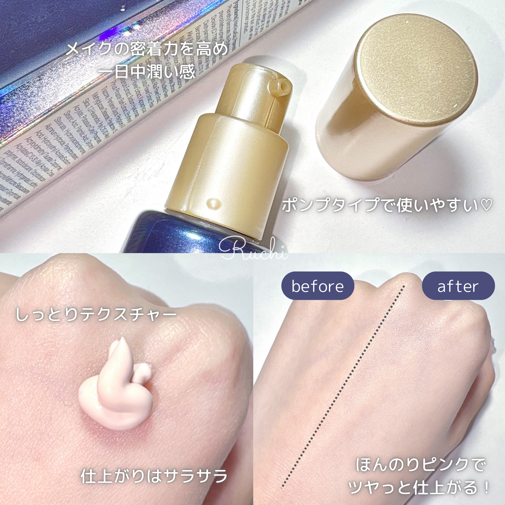 - SPF50+ PA++++ グルタチオン*やナイアシンアミド*が入った、スキンケア効果の高い、化粧下地としても使える日焼け止めです。 さらに、ヒアルロン酸*も入っているので、水分ケアまで可能!冬場でも、長時間乾燥が気になりにくい! スキンケアで肌を潤わしながら、日焼け対策もでき、化粧下地としてベースを整えてくれます。 しっとりとしたテクスチャーですが、仕上がりはベタっとせず、肌の角質層を潤わせるので、メイクの密着力を高め、長時間潤いを感じます。 ほんのりピンクがかった色で、肌に高級感と多幸感を演出してくれます。 *整肌成分