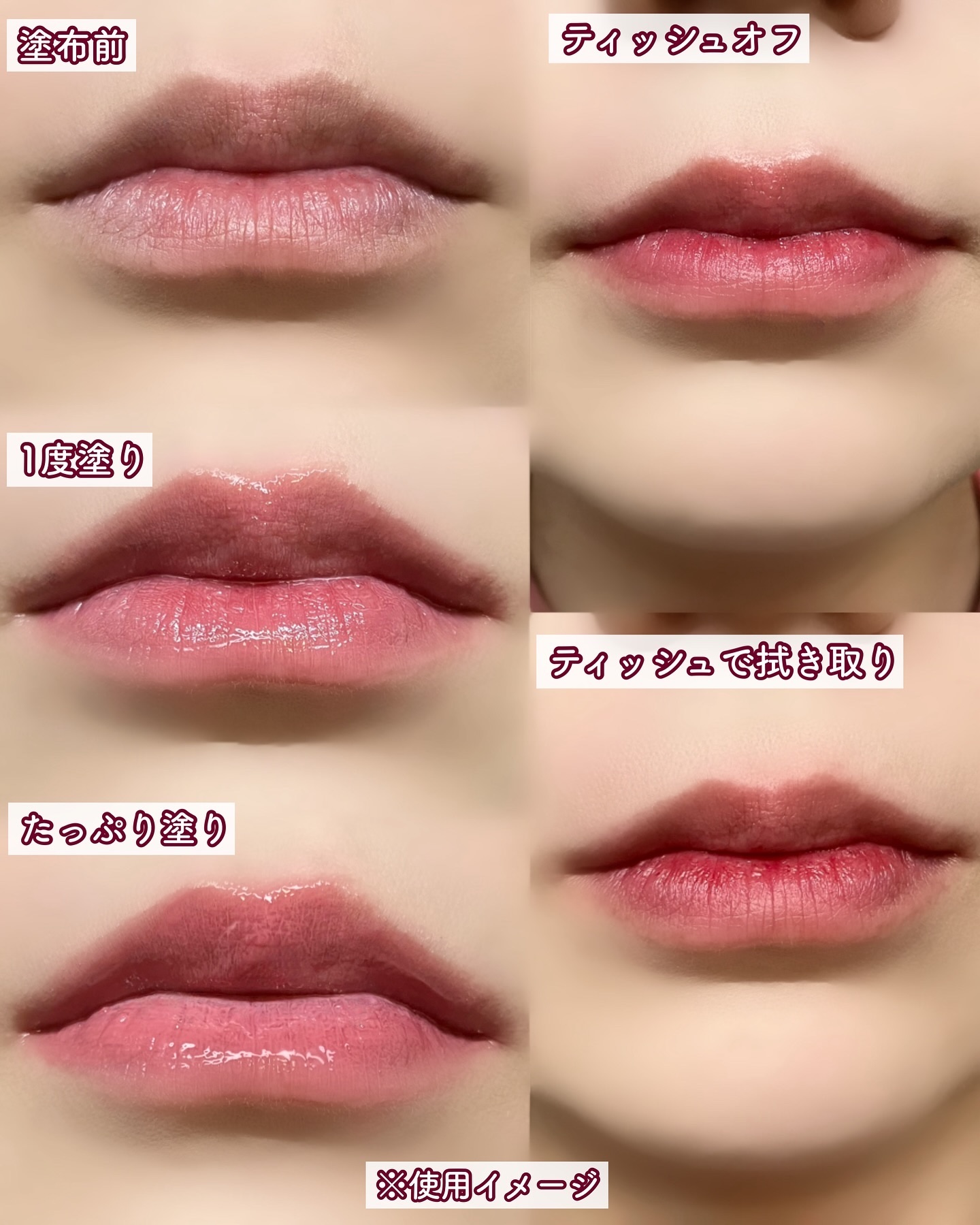 相変わらずオシャレなパケ❤️ このカラーがとてもキュート🥰 むっちり、と肌に密着しながらも伸びが良いです。 ぷるんとした質感❤️ 唇に塗ると、ほんのりスースー感。 香りはほぼないかな? カサついた私の薄い唇もふっくらナチュラルにプルンと ❤️ 透けるので、オーバーリップにする場合は重ね塗りでたっぷりした方が良さそう。 しっとりして👌 グロスのむちむち感はありますが、私には不快なベタベタ感ではなかったです。 また、ティッシュオフすると色は落ちちゃいますが、しっとり感は残ります❤️ 縦じわが目立ちにくくて良いです❤️ 他のリップと重ねるのも楽しみ🥰 1本持っておくと重宝しそうです☺️💕