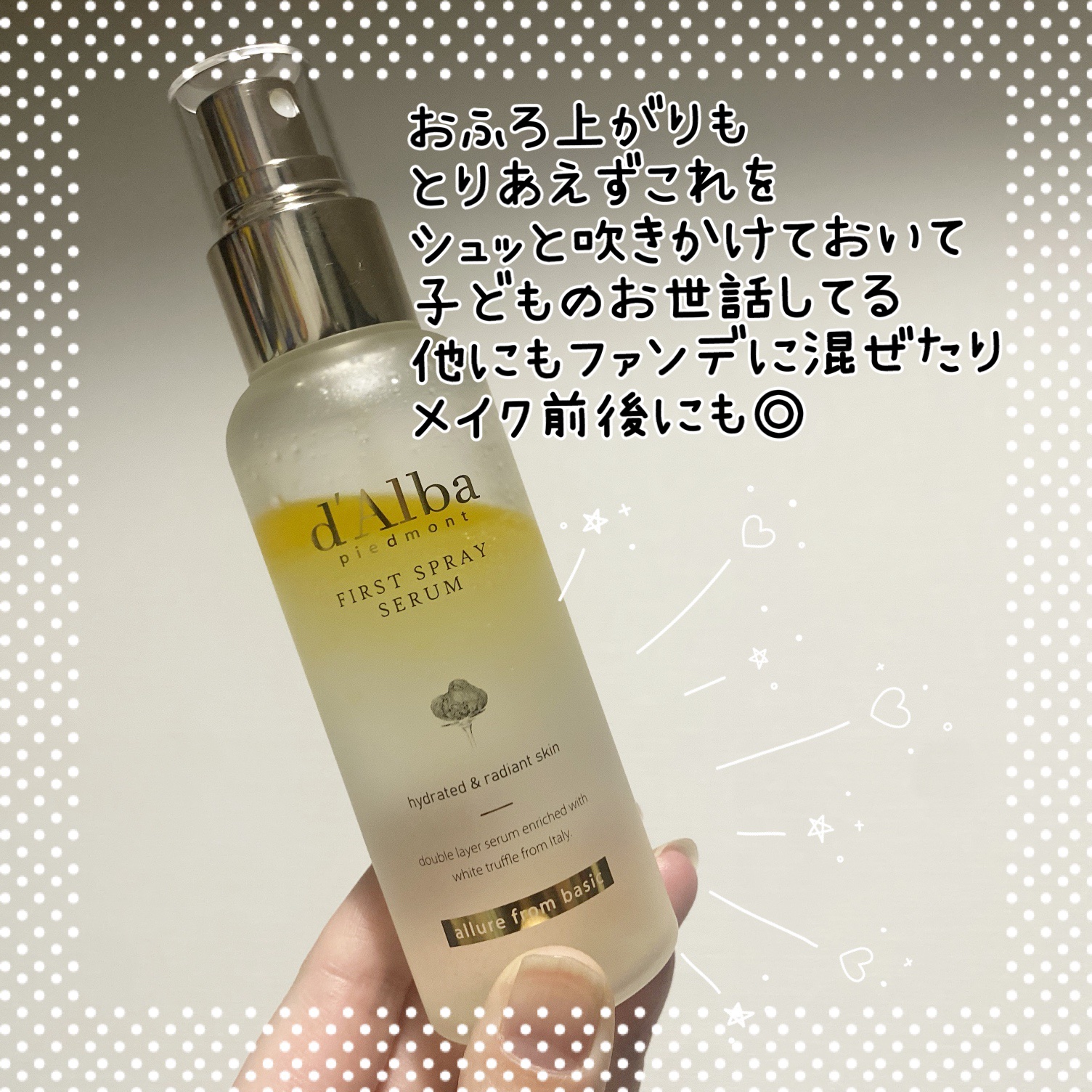 - イタリア産ホワイトトリュフ*と植物性オイルで豊かな水分を与えツヤ肌に仕上げる保湿ケアミストです。肌表面の保湿だけでなく、内側までしっかり二重で保湿可能。さらにダルバ独自のトリュフェロールTMが肌に弾力を与えます。霧のような細かなミストで洗顔後やお風呂上り以外のメイクの上からでもメイクを邪魔することなく使用することができます。 *ツベルマグナツムエキス(保湿成分) イタリアヴィーガン認証V-LABEL取得 皮膚低刺激テスト済み *全ての方に皮膚刺激が発生しないということではありません。 【ご使用方法】 1. 洗顔後、3~5回振って中身が十分に混ざった後、顔全体にまんべんなく噴射して軽くたたいて肌に馴染ませます。 * 鼻や口から吸い込まないように注意してください。 【使用上の注意】 お肌に異常が生じていないかよく注意して使用してください。化粧品がお肌に合わないとき即ち次のような場合には、使用を中止してください。そのまま使用を続けますと、症状を悪化させることがありますので、皮ふ科専門医等にご相談されることをおすすめします。 (1)使用中、赤味、はれ、かゆみ、刺激、色抜け(白斑等)や黒ずみ等の異常があらわれた場合 (2)使用したお肌に、直射日光があたって(1)のような異常があらわれた場合