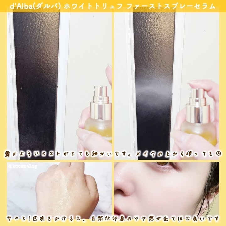 速攻ツヤミストの愛称でバズった、ダルバ ホワイトトリュフファーストスプレーセラム✨ セラムとオイル二層タイプの保湿ミストでトナー+ミスト+セラム+エッセンスを一度にまとめて手軽に保湿&弾力ケアできちゃう! 自然由来のイタリア産ホワイトトリュフ(ツベルマグナツムエキス)とトコフェロールを配合し、ダルバだけの成分「トリュフェロール™」で肌の角質層まで潤わせながらハリをケアします。 毎日エアコンでほんっっとに乾燥を感じていたけど、こちらのミストをシュッシュするとしっとり肌を維持してくれるしなによりツヤっとなるところが好き♡