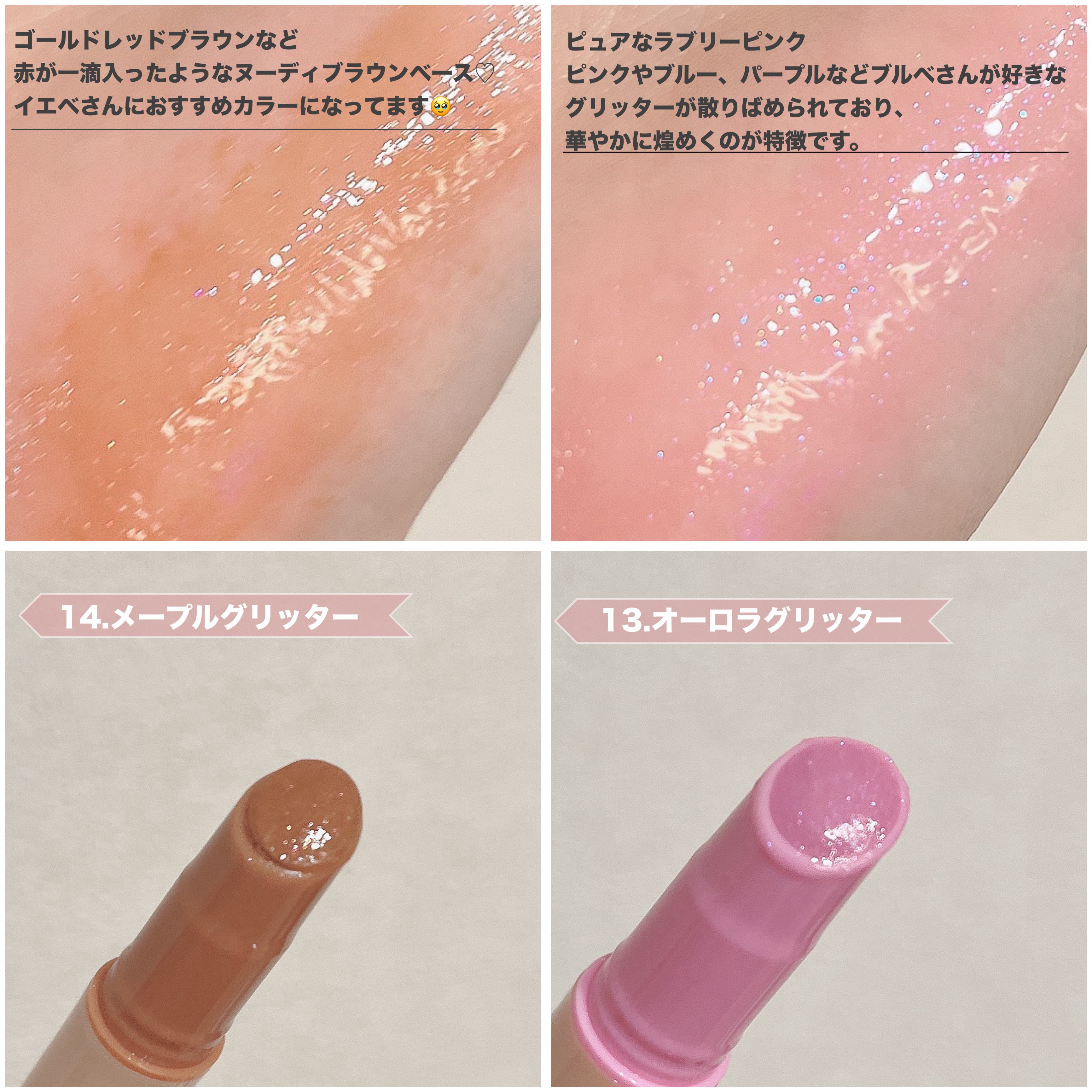 特に03.04番の新作は発売当初から大人気でいまでも店頭に並んでおらず、売り切れたら絶対買って!っていうこの商品。 01番はイエベ春さん、イエベ秋さんに特におすすめのカラーになってて、涙袋用にマット1色、艶系が2色、さらに血色影カラーの計4色が可愛らしいパレットに入ってるのが魅力的♡ なかでも、私が一目ぼれした画像②のラメカラーはとにかくつやっつやでめちゃくちゃ可愛くてお気に入り❤️🔥
