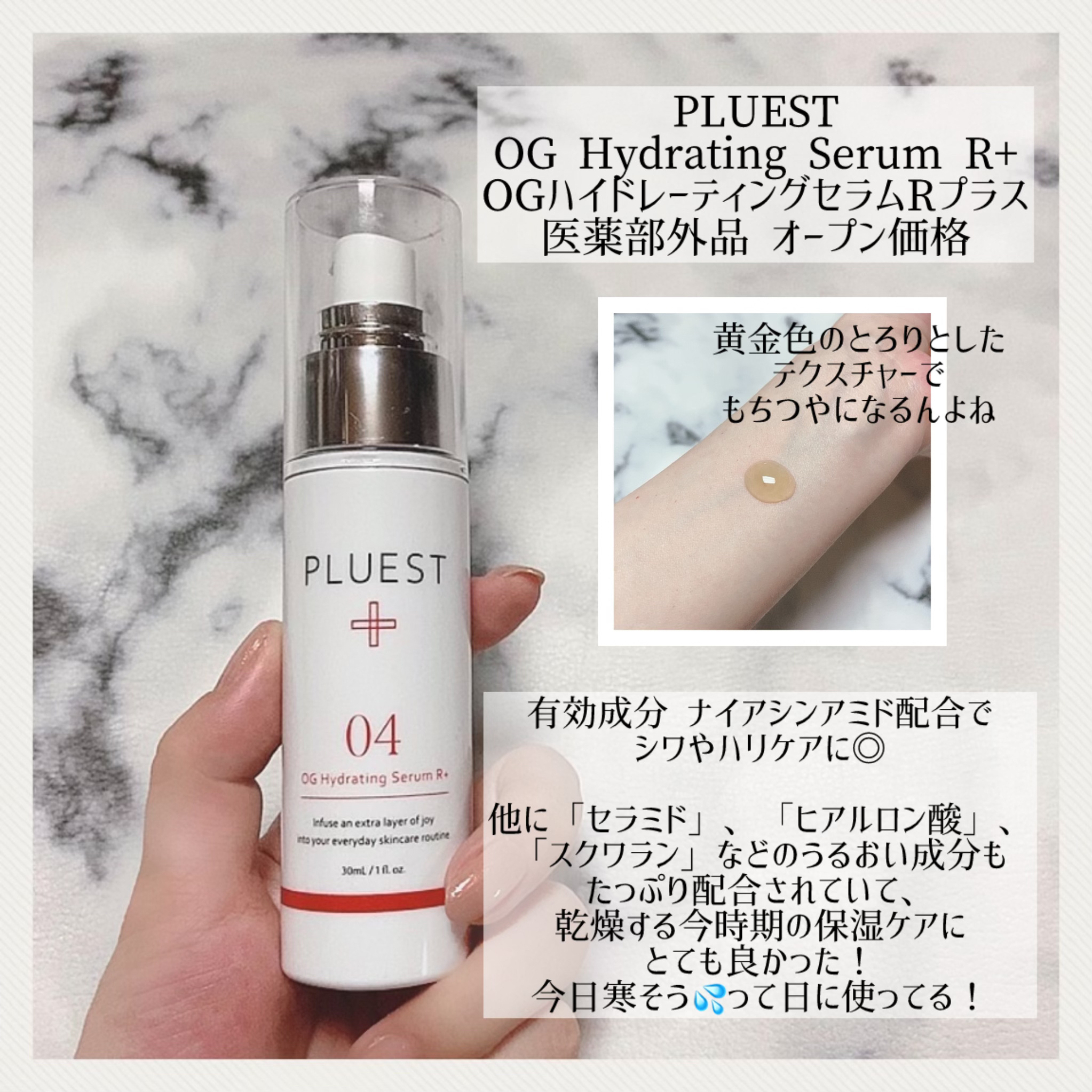 PLUESTのOGハイドレーティングセラムR+を使用しました。ジェル状の美容液でややペタ付くテクスチャー。けどアヌアのダークスポットセラムよりかはペタ付きは軽め。最近は特に乾燥が気になるので、いつものスキンケアにプラスするのに良かったです。保...
