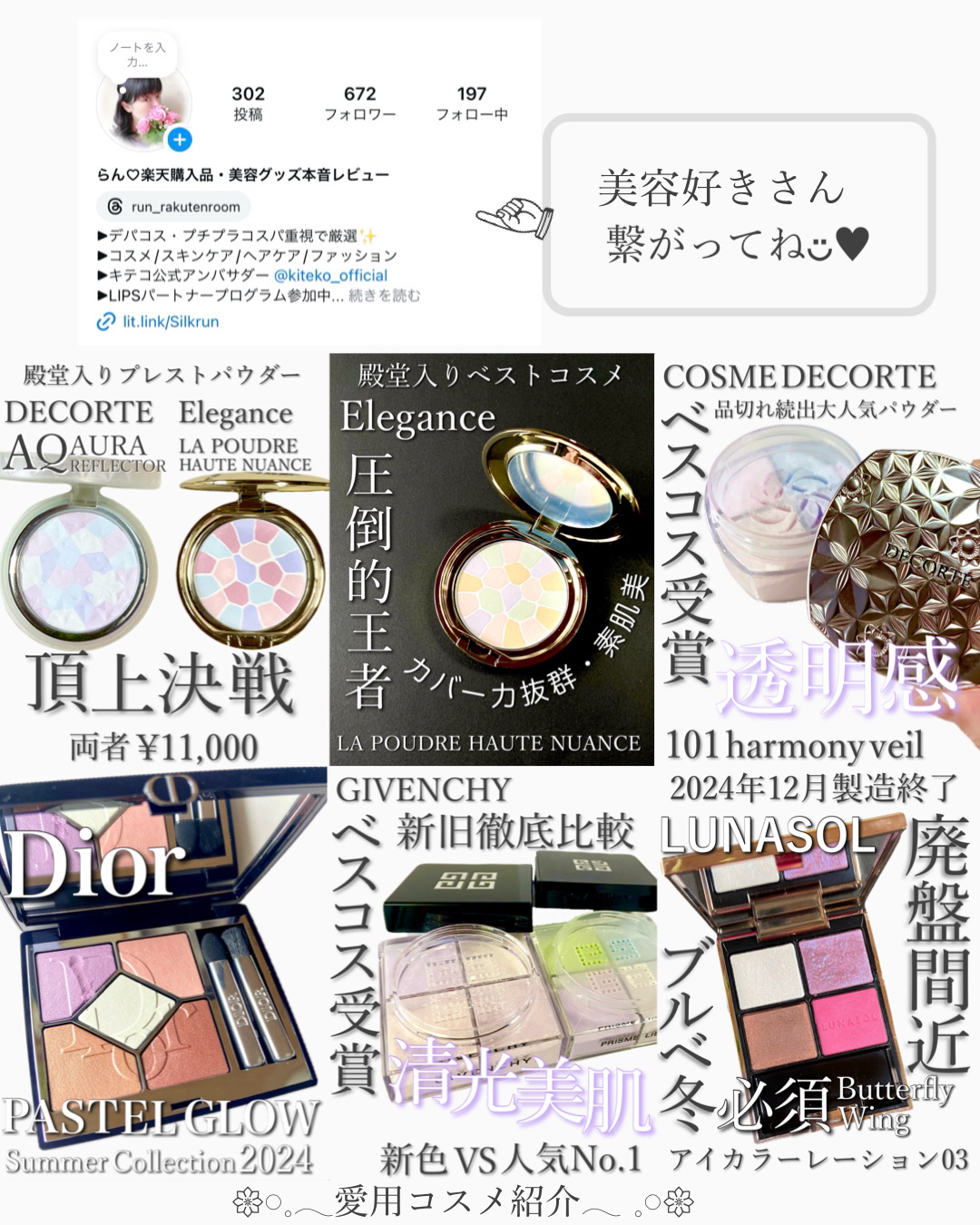 質感も5つに増えたので カラー選びの参考に💡 透明感がグッと上がる✨ 上品なベールを纏ったような ツヤ感 毛穴の凹凸や ほうれい線まで目立ちにくくなる 光コントロールは流石の一言‼︎ 綺麗さをキープできるのも🙆♀️ しっとりした粉質なので 乾燥が気になる秋冬に使いたくなる パウダーかな🤔 夏場汗をかく時は エレガンスや NARSのサラサラパウダーが 使いたくなる🤗
