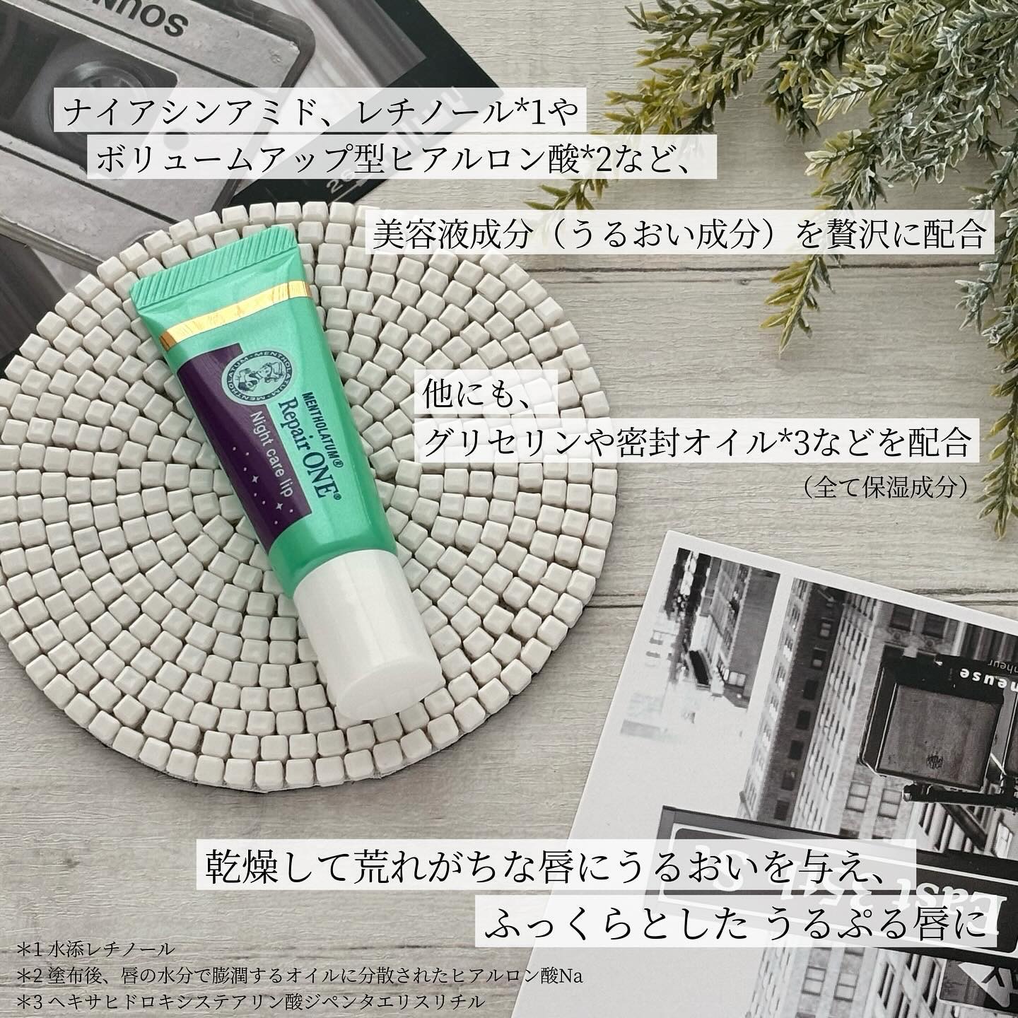 - ※商品パッケージは予告なく変更する場合がありますのでご了承ください。 「メンソレータム リペアワン ナイトケアリップ」は夜塗って集中浸透*1、3つの美容液成分(うるおい成分)配合で保湿パックできるリップエッセンスです。 唇をすこやかに保って荒れを防ぎ、ふっくらとうるおいのある唇に導いてくれます。 さらに、チューブタイプで使いやすく、のびがよく唇の凹凸を埋める縦ジワ密封処方*2も特徴的。 夜塗ってふっくらうるおった唇へ。 *1角層まで *2唇の凹凸を埋める製剤特徴のこと