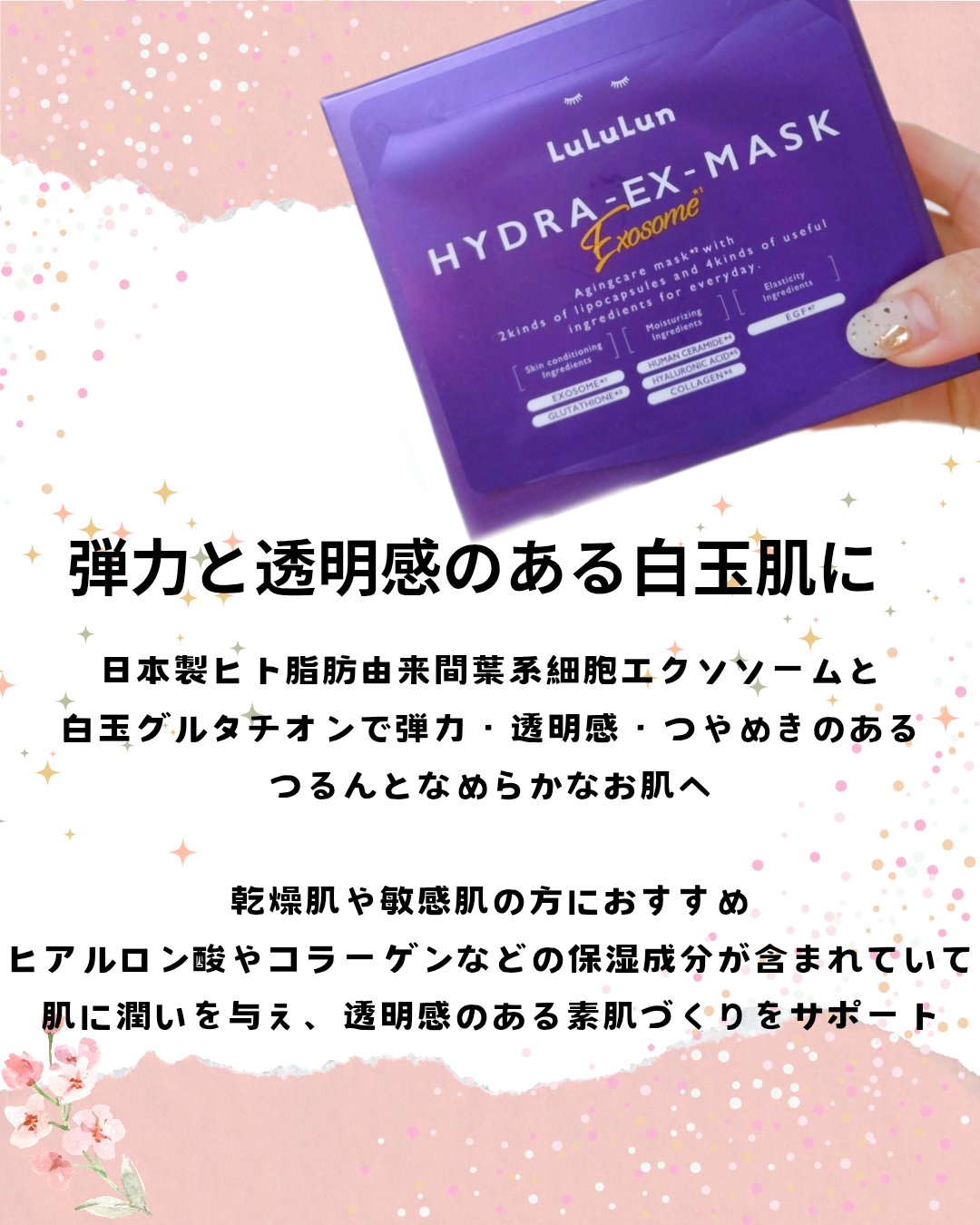 - ルルルンハイドラシリーズから新登場。うるおいにプラスするのは、「エクソソーム*1」。先端再生テクノロジーにインスパイアされた、デイリーエイジングケア※1マスクです。白玉※2グルタチオン*2をプラス配合し、弾力・透明感※3・つやめきのあるなめらかなお肌へ導きます。 (*1 整肌成分 ヒト脂肪由来間葉系細胞エクソソーム *2 整肌成分 グルタチオン、アルブチン、レシチン ※1 年齢に応じて肌へうるおいと弾力を与えるケアのこと ※2 白玉のようなキメが整ったツヤのある肌のこと ※3 うるおいを与えて、乾燥によるくすみを防ぐ)