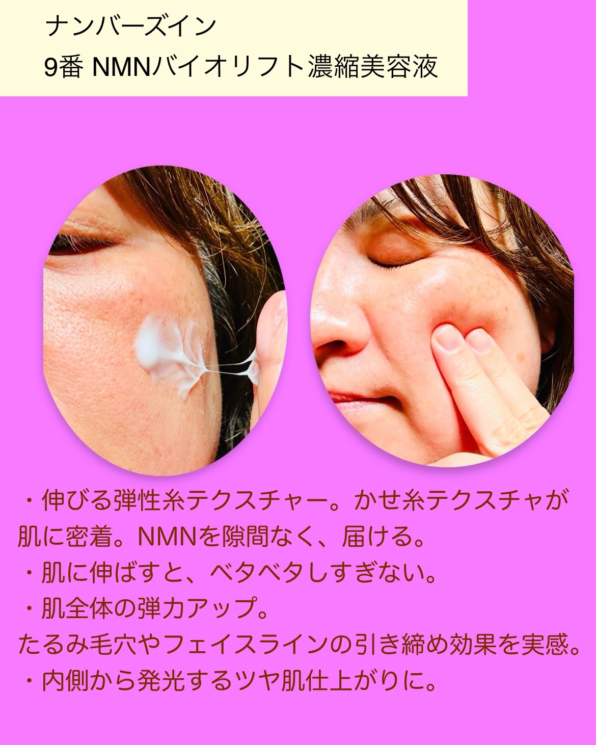 老化を遅らせる成分NMN! 皮膚の老化防止にはスキンケアでNMNを肌に塗って浸透させることが効果的という研究結果も! こちらの美容液の特徴はなんといっても伸びる糸リフトテクスチャー。 びよーんと伸びるまさに塗る糸リフトのような美容液でぴたっと肌に密着し、ぐいっと引き上げてくれるような使い心地の美容液です。 NMN BIOがたるみ毛穴やほうれい線にアプローチしてくれます✨ 1/1(水)~1/7(火)のQoo10新年セールで、こちらの9番美容液を買うと9番シートマスク1枚がついてくるお得なイベントも開催されます!