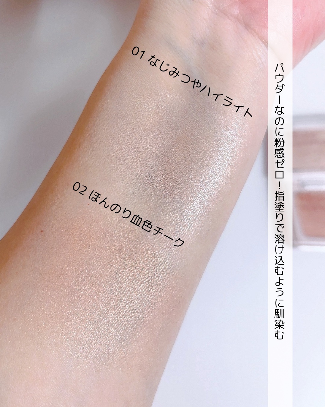 エテュセのフェイスカラー、待ってましたー!! もうね、ほんとうに使用感がよかった✨ うるおいが長時間続くスキンケア仕立てでテクスチャーだけでなく肌もしっとりが続く🫧 01 なじみつやハイライト 繊細な輝きでうるおったツヤ肌を演出 白浮しないピンクベージュ♡