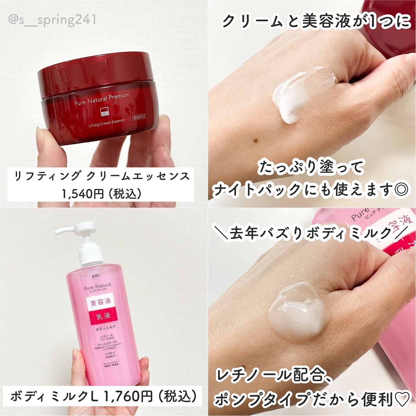 2in1で時短かつキレイが叶う..🤍 pdcピュアナチュラル新シリーズ[ピュアナチュラルプレミアム リフティング]は、ナイアシンアミドにピュアレチノールとレチノール誘導体のW配合で、今気になっている目元・口元のシワはもちろん、未来のシミ予防にもアプローチしてくれるエイジングケアシリーズ🫶🏻 レチノールを配合したボディミルクは、ひじひざなども驚きのツルスベなめらか肌に!✨