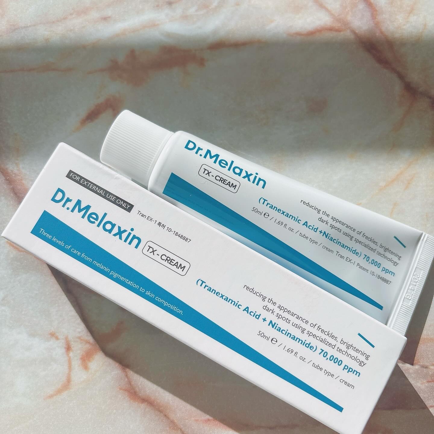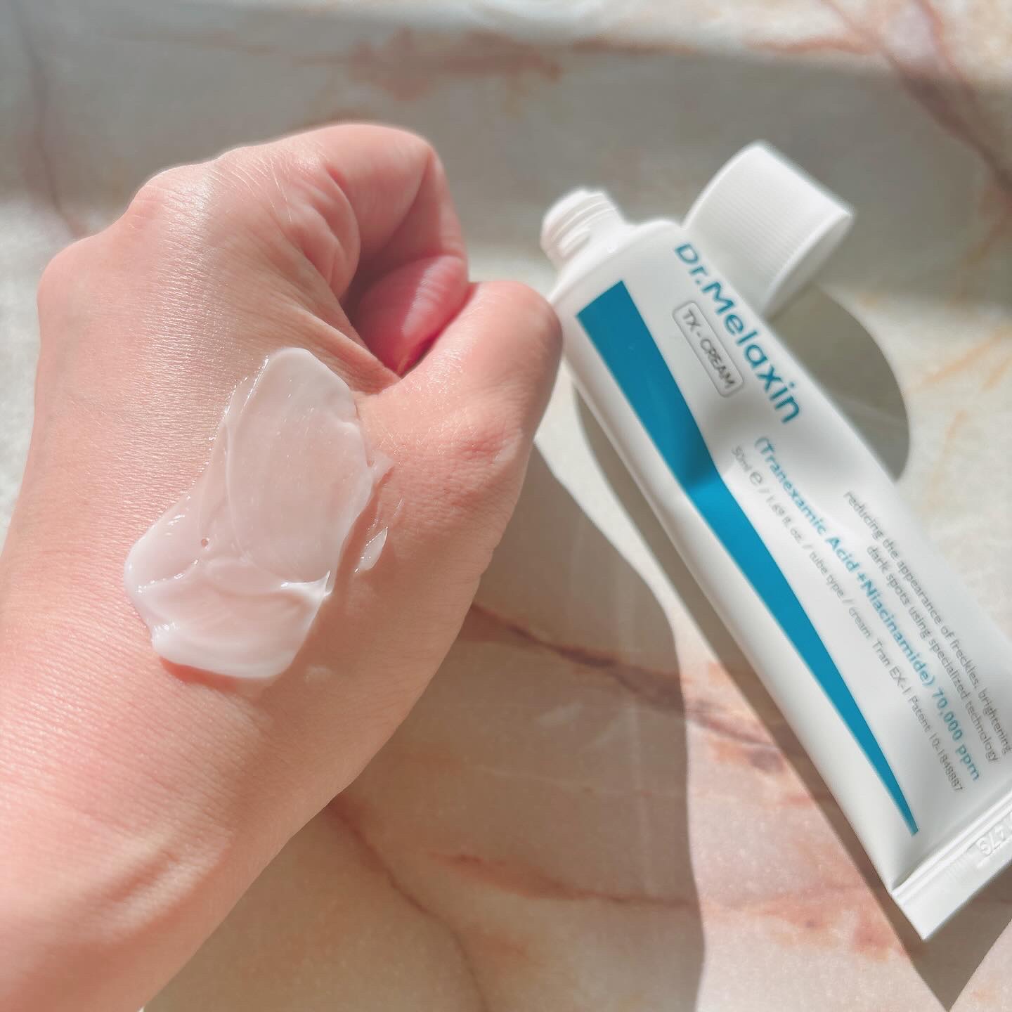 Dr.MelaxinのTXシリーズはシミの飲み薬や注射に使用されるトラネキサム酸配合スキンケア代表作!!! ナノトラネキサム酸でより浸透しやすく べたつかないさらっとテクスチャ一で季節を問わず年中使用できそう◎ クリームにしてはさっぱりした軽めの印象なのでベタつきが苦手の方にはすごくおすすめクリームです☝️