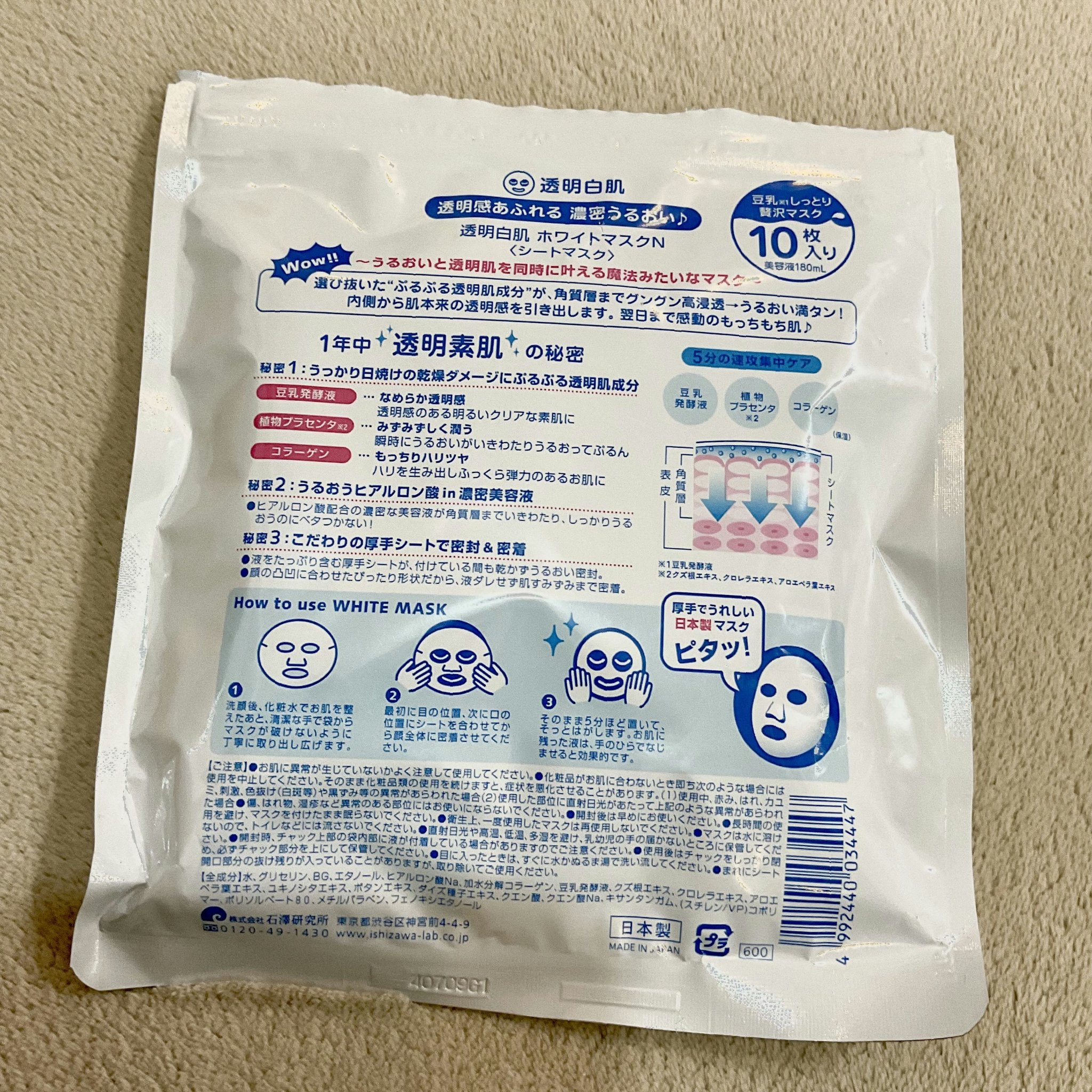 - <ホワイトマスクN> 水、グリセリン、BG、エタノール、ヒアルロン酸Na、加水分解コラーゲン、豆乳発酵液、クズ根エキス、クロレラエキス、アロエベラ葉エキス、ユキノシタエキス、ボタンエキス、ダイズ種子エキス、クエン酸、クエン酸Na、キサンタンガム、(スチレン/VP)コポリマー、ポリソルベート80、メチルパラベン、フェノキシエタノール