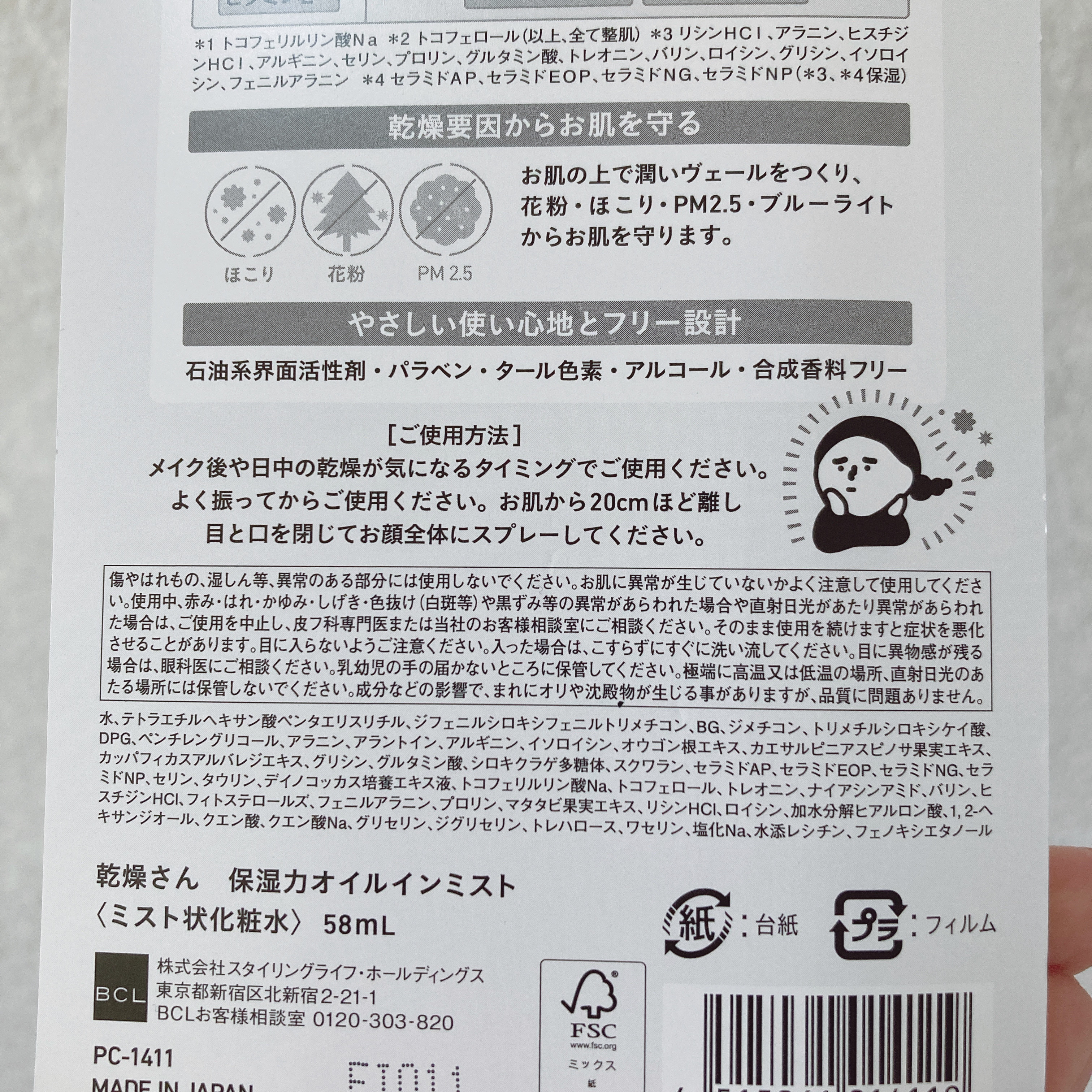 - 企業限定 カサカサ、ムズムズに メイクの上からもシュッと乾燥にひと吹き! オイルインミストでツヤツヤ肌 ●オイルin2層タイプで潤い輝くツヤ肌に べたつかずに、ツヤと柔軟性を与えるオイル成分をたっぷり配合。乾燥による肌荒れを防ぎながら、しっとり潤ってツヤツヤの肌に。 【肌荒れ対策】 TPNa*1 ・ビタミンE*2 【潤いケア】 ナイアシンアミド(整肌)・ワセリン(保湿)・アミノ酸*3 ・ヒト型セラミド*4 ・スクワラン(保湿) ●乾燥要因からお肌を守る お肌の上で潤いヴェールをつくり、花粉・ほこり・PM2.5・ブルーライトからお肌を守ります。 ●1日中お肌を守って、しっとり保湿 カサカサ、ムズムズ、乾燥崩れにシュッとひと吹き。メイクの上からも使えるから、いつでも、どこでも、乾燥が気になる時に使えます。 ●やさしい使い心地とフリー設計 石油系界面活性剤・パラベン・タール色素・アルコール・合成香料フリー *1 トコフェリルリン酸Na *2 トコフェロール(以上、全て整肌) *3 リシンHCI、アラニン、ヒスチジンHCI、アルギニン、セリン、プロリン、グルタミン酸、トレオニン、バリン、ロイシン、グリシン、イソロイシン、フェニルアラニン *4 セラミドAP、セラミドEOP、セラミドNG、セラミドNP(*3、*4保湿)