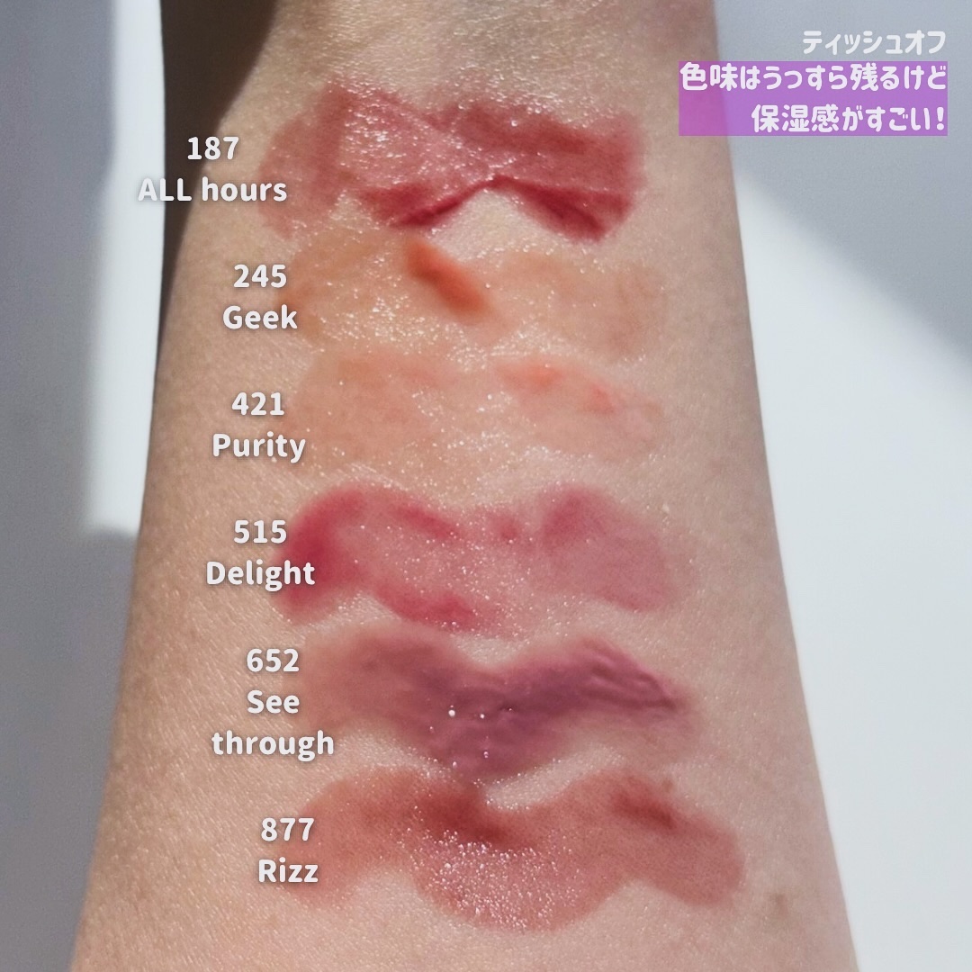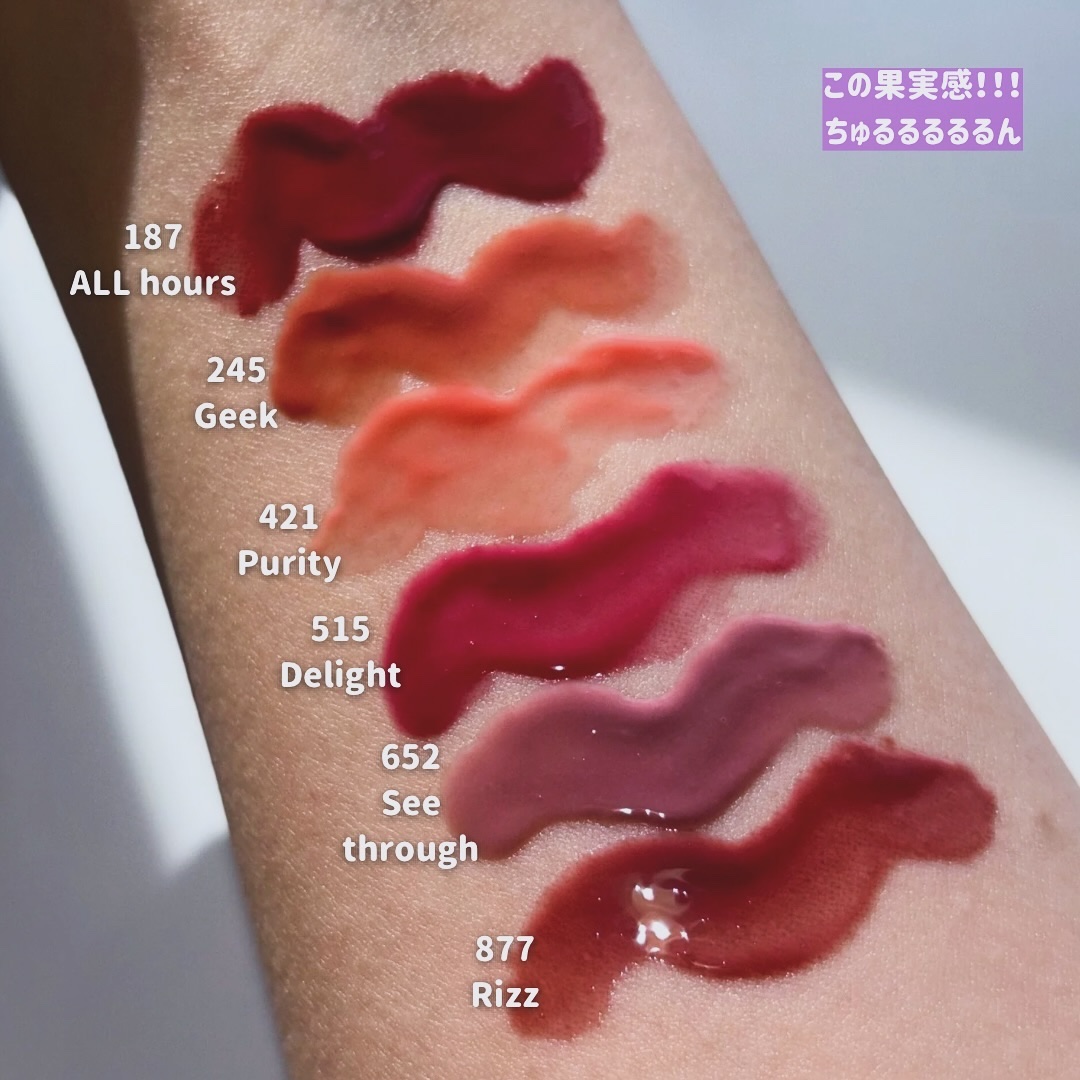 グロウティントとウォーターティントの良いとこどり♡ ✔︎︎︎︎塗り重ねるほど鮮やかなカラー ✔︎︎︎︎透明に浮き上がる水光 ✔︎︎︎︎長時間維持される密着ロングラスティング ちゅるんとした仕上がりがめちゃかわいかった~🩷 べたつかないから軽い塗り心地◎🥰 色持ちのよさ凄い…飲み会リップって言われてるの納得🫶 わたしは06.08がお気に入り~💗