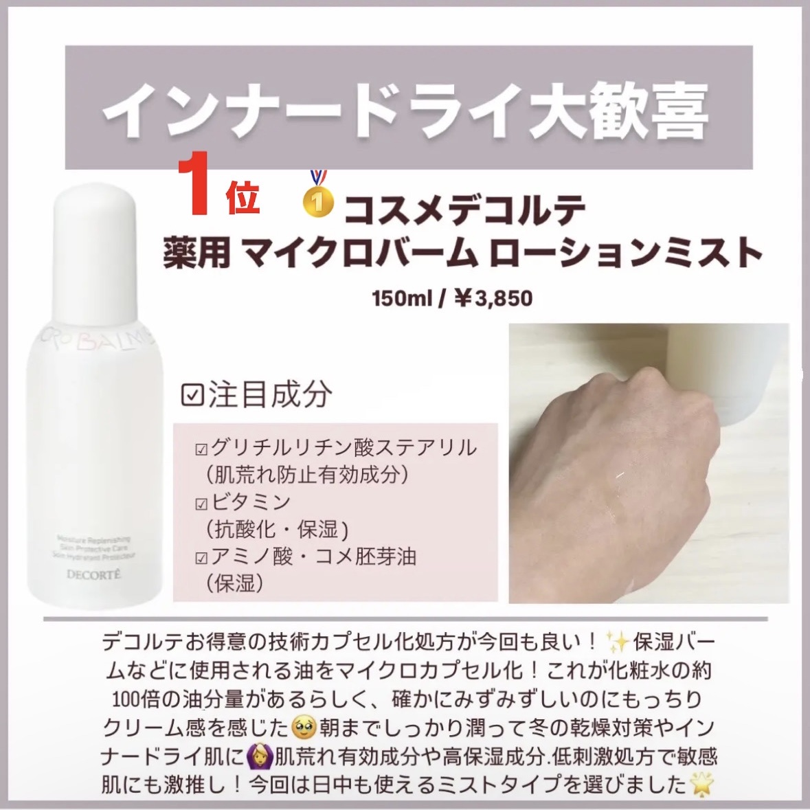 DECORTÉコスメデコルテ薬用マイクロバームローションミスト〈薬用化粧液〉¥3,850#肌荒れ#乾燥肌#デパコス#乾燥対策#ミスト化粧水#肌荒れ防止#肌荒れケア#decorte#デコルテ#コスデコ#コスメデコルテ#化粧水#ローション#ミスト...