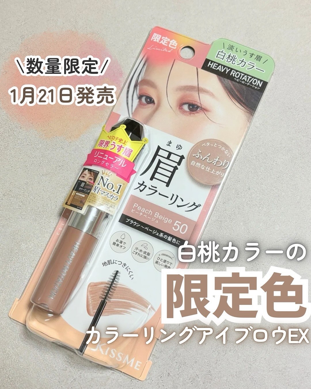 淡く柔らかいピーチカラーが数量限定で登場するよ🍑 自眉のようにふんわり自然な仕上がり 薄膜フィルム処方を採用。 長時間落ちにくいのに、お湯で簡単オフできるのも嬉しいポイント!