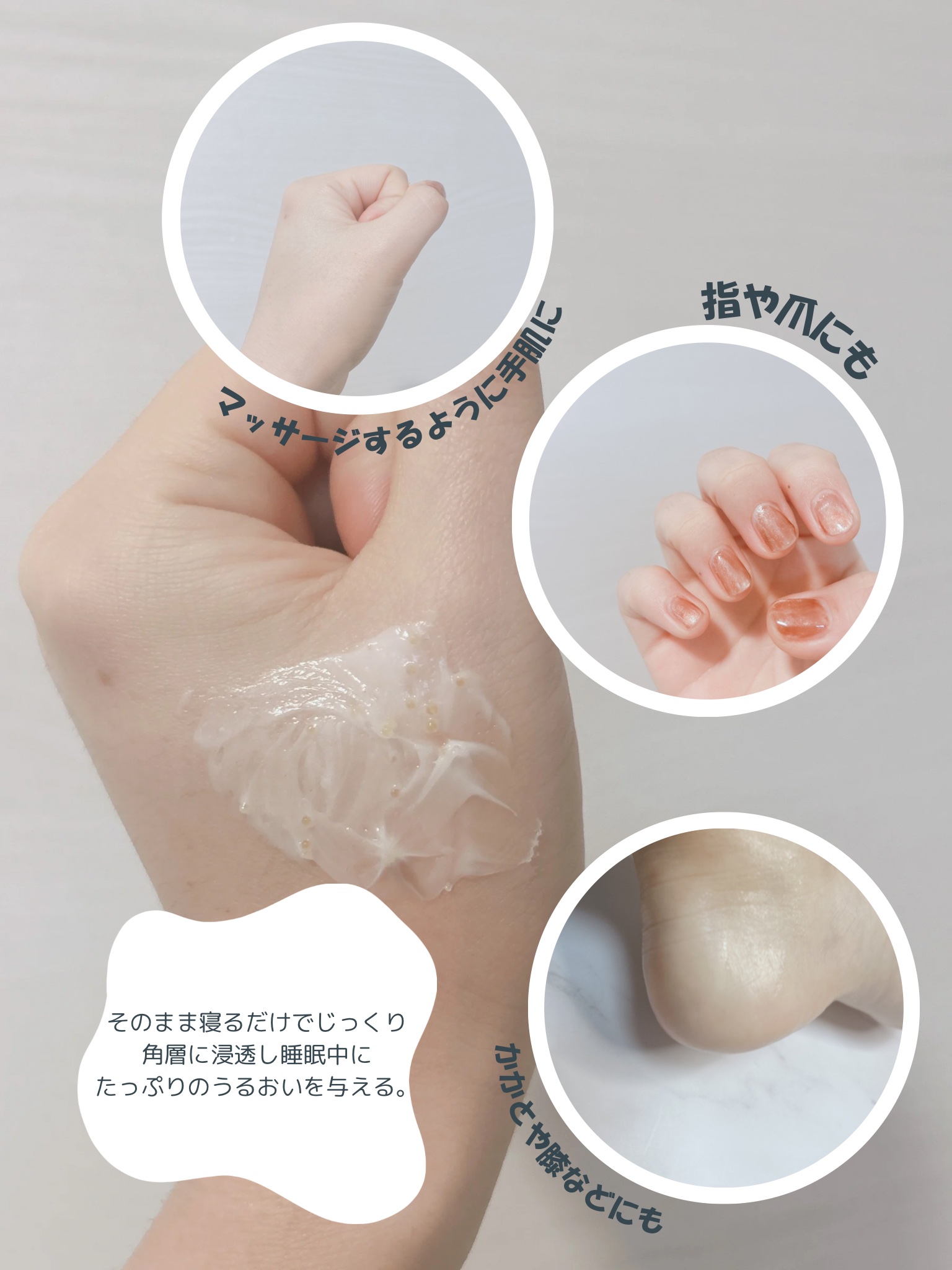 - こっくり濃厚なクリームに、たっぷりの美容液成分がぎゅっと詰まったカプセルを配合。 おやすみ前にマッサージするように手肌にぬりこむと、カプセルが崩れて美容液成分※1が肌に広がります。 夜美容で、寝ている間にじっくり角層に浸透、翌朝ふっくらうるおったハリのある手肌に。 さらに気になる爪・指先までうるおって美しく。ドリーミーアロマの香り。 ※1ローヤルゼリーエキス&パンテノール(保湿成分)