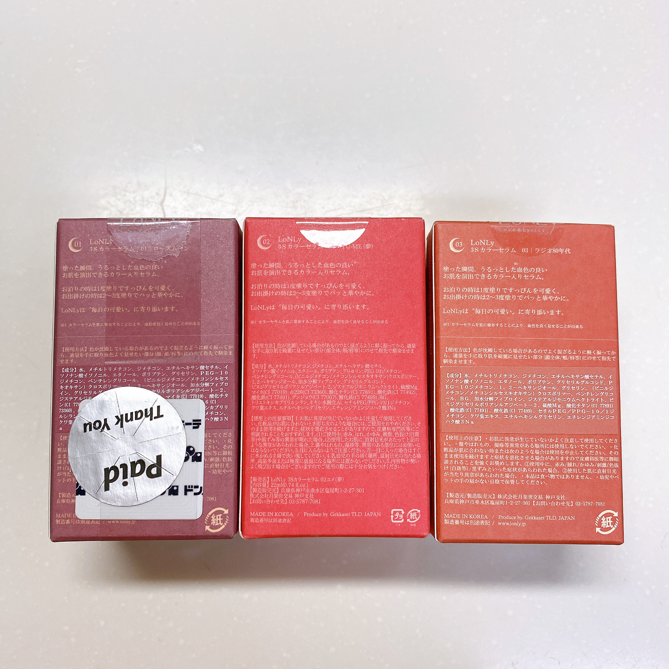 - <01 Rose Moon> 水、メチルトリメチコン、ジメチコン、エチルヘキサン酸セチル、イソノナン酸イソノニル、エタノール、ポリブテン、グリセリン、PEG-10ジメチコン、ペンチレングリコール、(ビニルジメチコン/メチコンシルセスキオキサン)クロスポリマー、1,2-ヘキサンジオール、加水分解フィブロイン、グリセリルグルコシド、ビスジグリセリルポリアシルアジペート-2、ジステアルジモニウムヘクトライト、硫酸Mg、マイカ(CI77019)、酸化チタン(CI77891)、酸化鉄(CI77491)、グンジョウ(CI77007)、赤226(CI73360)、酸化鉄(CI77492)、酸化鉄(CI77499)、BG、トリエトキシカプリリルシラン、オキシ水酸化Al、セチルPEG/PPG-10/1ジメチコン、クワ葉エキス、エチルヘキシルグリセリン、エチレンジアミンジコハク酸3Na <02 YU-ME> 水、メチルトリメチコン、ジメチコン、エチルヘキサン酸セチル、イソノナン酸イソノニル、エタノール、ポリブテン、グリセリン、PEG-10ジメチコン、ペンチレングリコール、(ビニルジメチコン/メチコンシルセスキオキサン)クロスポリマー、1,2-ヘキサンジオール、加水分解フィブロイン、グリセリルグルコシド、ビスジグリセリルポリアシルアジペート-2、ジステアルジモニウムヘクトライト、硫酸Mg、マイカ(CI77019)、赤226(CI73360)、酸化チタン(CI77891)、酸化鉄(CI77492)、酸化鉄(CI77491)、グンジョウ(CI77007)、酸化鉄(CI77499)、BG、トリエトキシカプリリルシラン、オキシ水酸化Al、セチルPEG/PPG-10/1ジメチコン、マグワ葉エキス、エチルヘキシルグリセリン、エチレンジアミンジコハク酸3Na <03 Radio 80’s > 水、メチルトリメチコン、ジメチコン、エチルヘキサン酸セチル、イソノナン酸イソノニル、エタノール、ポリブテン、グリセリルグルコシド、PEG-10ジメチコン、1,2-ヘキサンジオール、グリセリン、(ビニルジメチコン/メチコンシルセスキオキサン)クロスポリマー、ペンチレングリコール、BG、加水分解フィブロイン、ジステアルジモニウムヘクトライト、ビスジグリセリルポリアシルアジペート-2、硫酸Mg、酸化チタン(CI77891)、酸化鉄(CI77491)、酸化鉄(CI77499)、セチルPEG/PPG-10/1ジメチコン、クワ葉エキス、エチルヘキシルグリセリン、エチレンジアミンジコハク酸3Na <04 May Star> 水、メチルトリメチコン、ジメチコン、エチルヘキサン酸セチル、イソノナン酸イソノニル、エタノール、ポリブテン、グリセリルグルコシド、PEG-10ジメチコン、1,2-ヘキサンジオール、グリセリン、(ビニルジメチコン/メチコンシルセスキオキサン)クロスポリマー、ペンチレングリコール、BG、加水分解フィブロイン、ジステアルジモニウムヘクトライト、ビスジグリセリルポリアシルアジペート-2、硫酸Mg、酸化チタン(CI77891)、酸化鉄(CI77492)、酸化鉄(CI77491)、酸化鉄(CI77499)、セチルPEG/PPG-10/1ジメチコン、クワ葉エキス、エチルヘキシルグリセリン、エチレンジアミンジコハク酸3Na