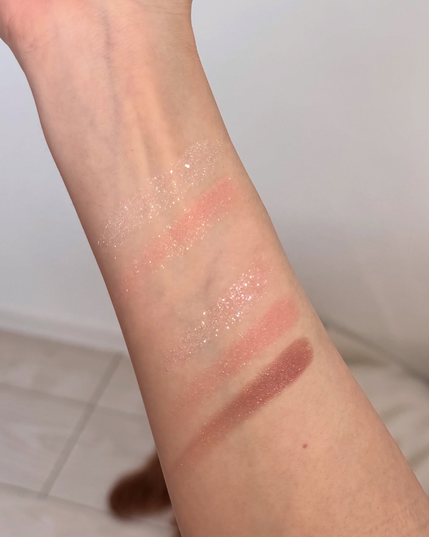 右上のピンクラメをベースに仕込んでメイクしたんだけどツヤと煌めき感えぐすぎる😳💎可愛い、、 そこに右下のカラーを重ねるとじんわり血色感が滲み出るような目元になるよ🦩 これは欠品店舗続出しそう🫣
