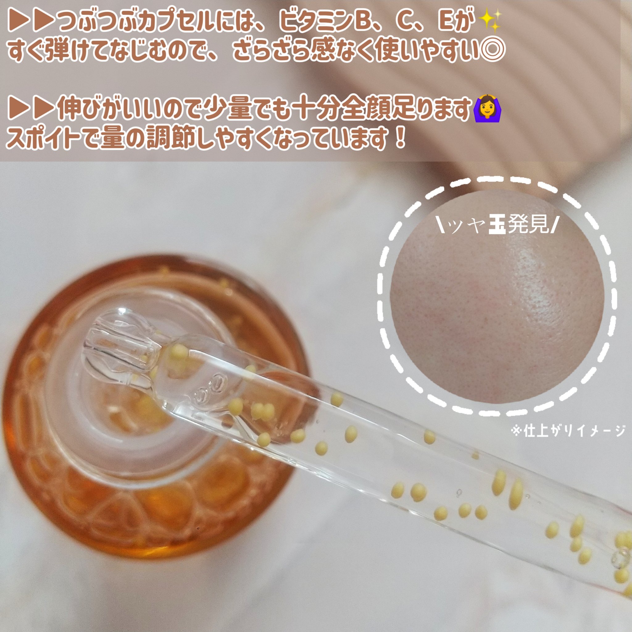 | 肌に触れた瞬間 カプセルが パッと弾けてなじむ~💖とろ~りテクスチャーだけど 軽くてベタつかず しっとり艶々肌に | 詳細を見る | |