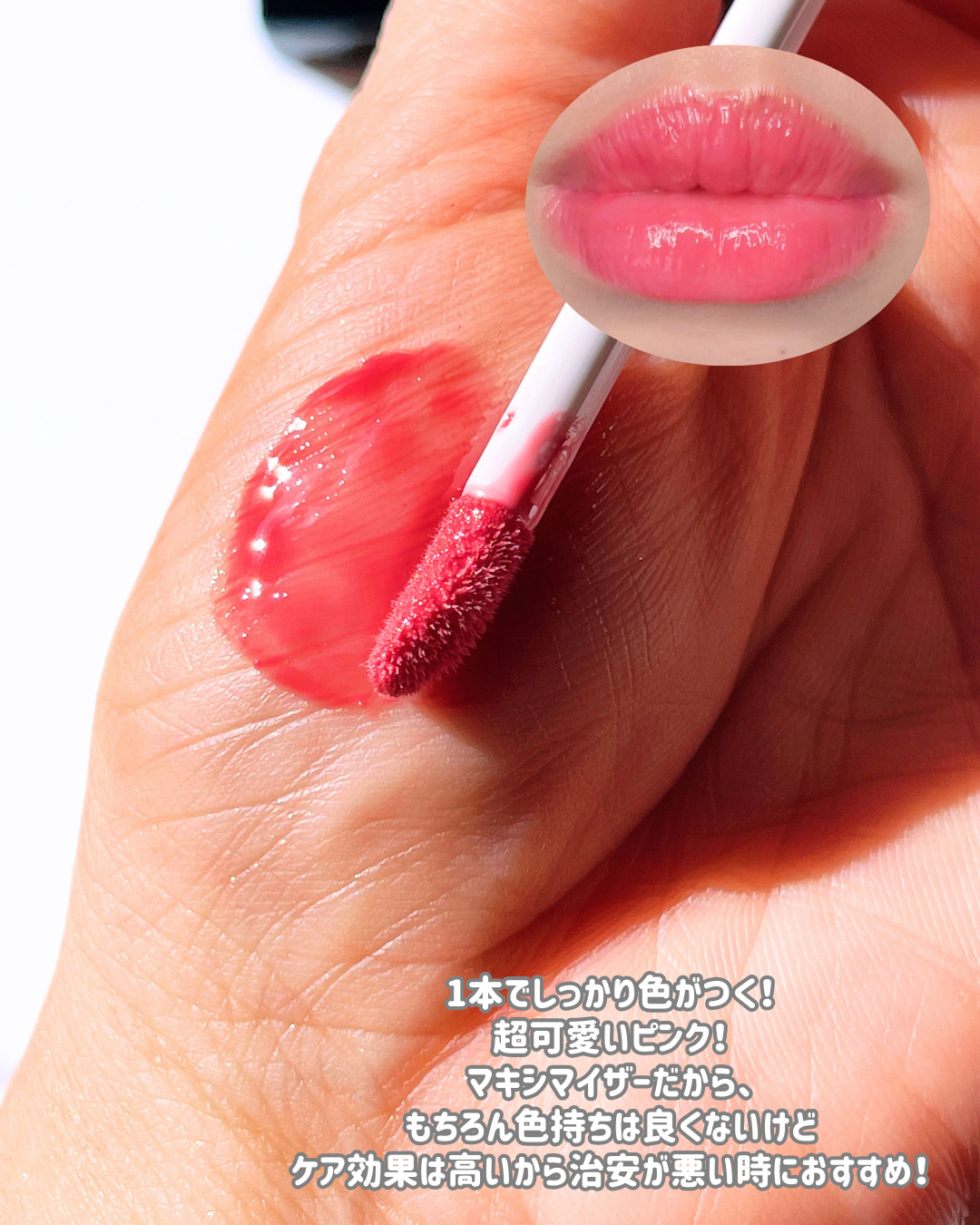 うさぎの舌リップみたいな色だよね? ほのかにプランプ効果があって、気持ちスースーするけど、 ピリピリしないからプランパー初心者でも使えるよ🌸 発色も良くて色持ちもいいからおすすめ! コロンとしたパケも可愛い🫶🏻