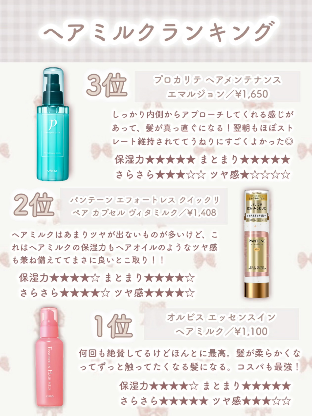| ヘアミルクランキング第193位 | 緩めのミルクで馴染みやすい♡ 乾燥を防いでまとまりやすい。カラーで傷んだ毛にも◎ | 詳細を見る | |