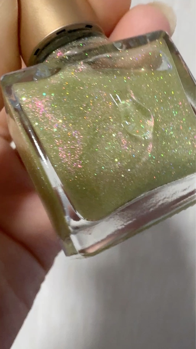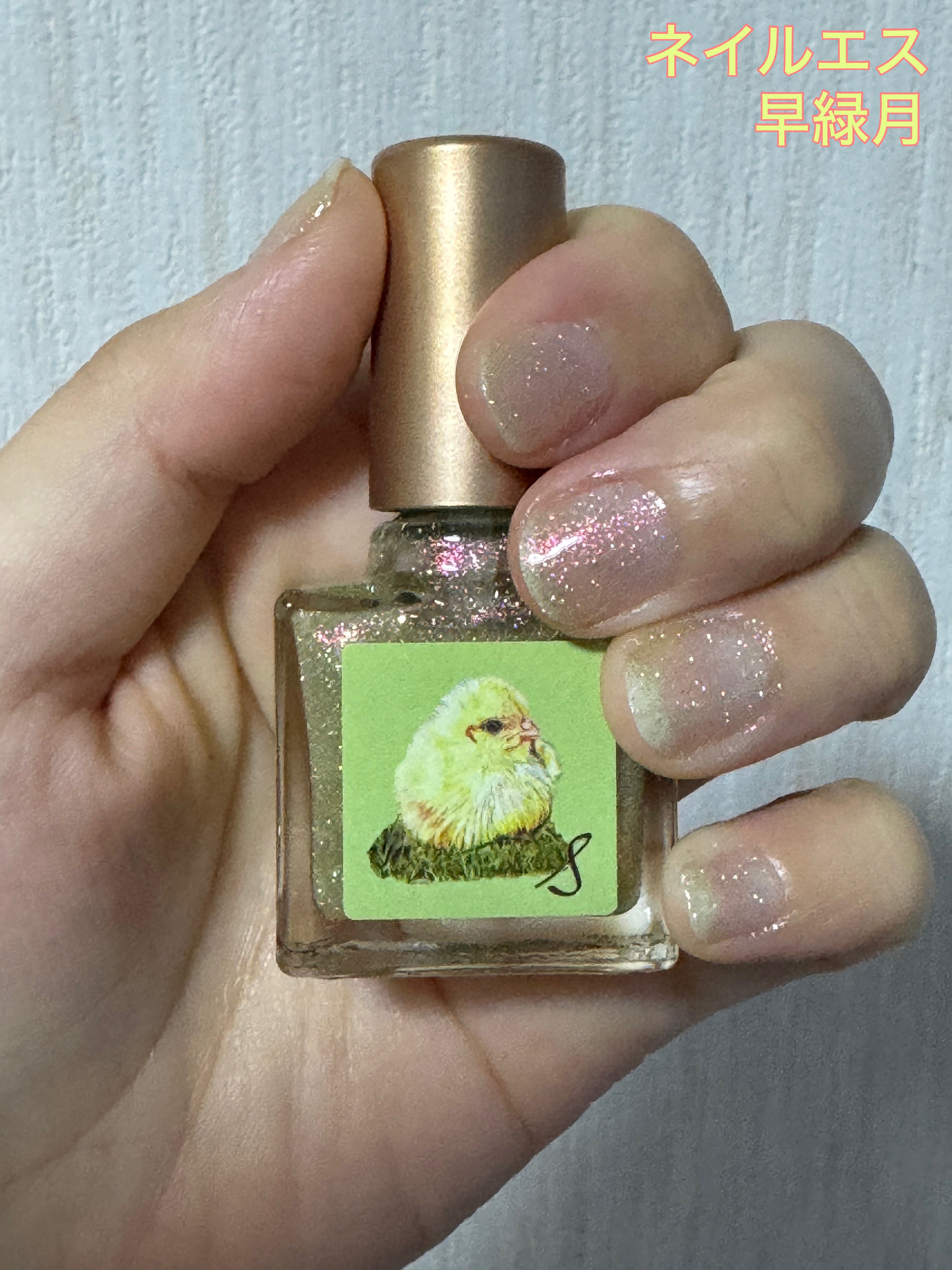 ネイルエス暦シリーズ/1月早緑月(さみどりつき)1度塗り💅木々の緑が芽吹く様子をイメージしたカラーとのこと。パケ見ながら塗ってたのでチラチラキラキラ光るラメがぴよぴよ語りかけてくるかのようで可愛い〜となってました🐣#セルフネイル#セルフネイル...
