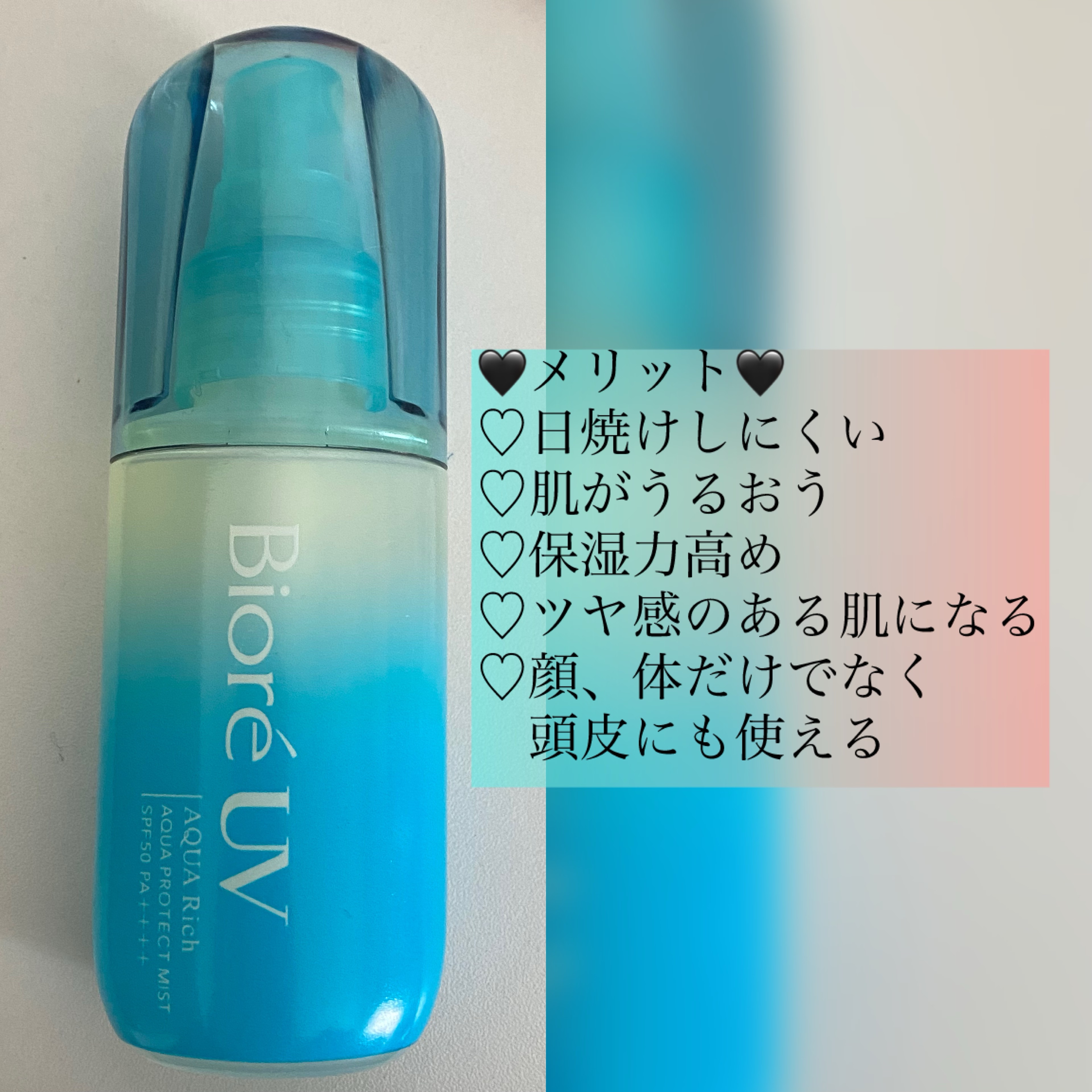 ビオレUVアクアリッチアクアプロテクトミスト ¥1,078ミストタイプの日焼け止め🧴☀️塗布したあとの感触は化粧水つけた後みたいにしっとりするよ片手でワンプッシュで塗布できて1人では塗りにくいところも簡単に塗布できる🌻塗布した後は軽く馴染ませ...