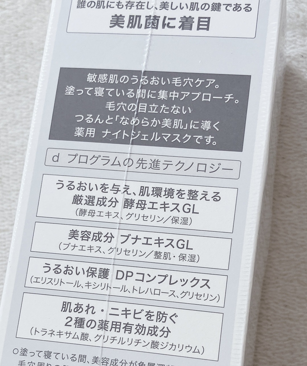 - 塗って寝ている間に集中アプローチ。 毛穴の目立たないつるんとなめらか美肌に導く薬用ナイトジェルマスク 誰の肌にも存在し、美しい肌の鍵である美肌菌に着目したd プログラム。 塗って寝ている間に集中アプローチ。 うるおって毛穴の目立たない「なめらか美肌」に導く薬用ナイトジェルマスク。 毛穴周りの肌にうるおいを与え続け、きめを整え毛穴の目立たない肌に導きます。 美容成分ブナエキスGL(ブナエキス、グリセリン/保湿)。 ●厳選成分配合、クリーン製法 ●パラベン(防腐剤)フリー、アルコール(エチルアルコール)フリー ●無香料、無着色、弱酸性 ●低刺激設計。敏感肌の方のご協力によるパッチテスト済み* ●スティンギングテスト済み* *すべての方にアレルギーや皮ふ刺激がおきないわけではありません。 <使用方法> ●週2~3回を目安に、夜のお手入れの最後にお使いください。 ●手のひらに直径約2cmの円を目安にとり、両ほおにたっぷり塗り広げた後、顔全体にのばします。 ●肌を覆ったまま触れずにしばらく待つと、ジェルが肌になじんでいきます。 洗い流し不要で、そのままおやすみいただけます。(なじむ時間には個人差があります。)