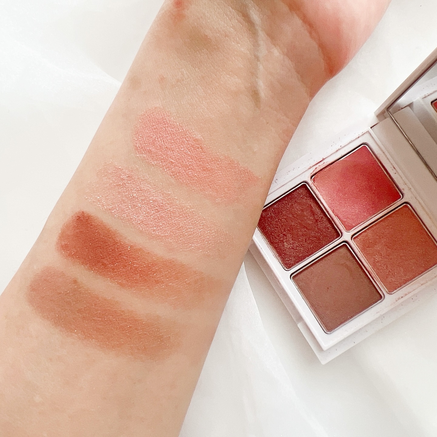 秋冬らしいモーヴピンク。左上①のカラーはばバームのようなしっとり質感。美発色&高密着カラーのパレットで、可愛くも深みのあるメイクも可能◎ マルチパレットなので、単色使いで目元以外のチーク、ハイライト、リップとしても使用可能◎ モーヴピンクとブラウンで深みあるメイクは秋冬にピッタリ!