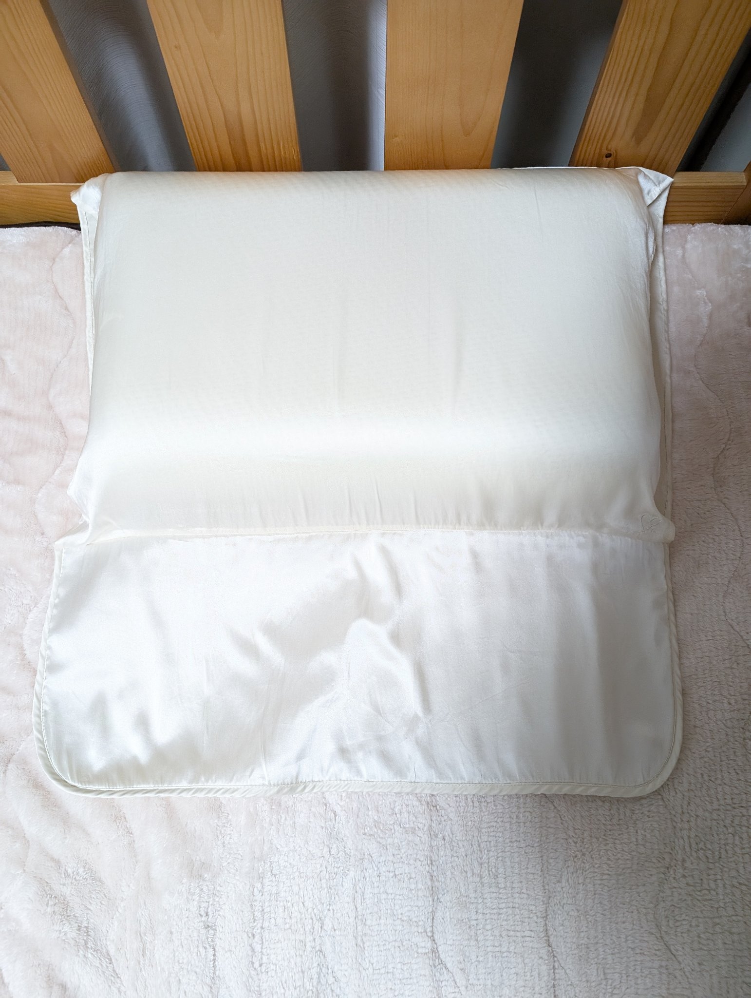 - シルク100%の枕カバーで就寝中の乾燥、摩擦対策! 寝ている間に髪が絡んで朝にはボサボサ… マスク生活で気になるお肌… 摩擦や乾燥による髪や肌のお悩みがある方に向けて、表生地シルク100%の枕カバーが新登場! ナイトキャップが流行中ですが、帽子を被って寝るのが苦手という方にもオススメです。 当社独自設計のロングパッド付き。髪の毛先やデコルテ周りのお肌までカバー! 通常のピローケースには無い25cmのロングパッド付きで、長い髪の毛先やデコルテ周りのお肌までやさしく保護します。 ロングパッドの裏地は通気性のよいエアメッシュ生地使用で裏面が滑りにくく、カバーがズレにくいのも嬉しい! 取り付け簡単!筒状だから枕を差し込むだけ! 金属が付いていないから髪がひっかかるなどのトラブルもなし! (標準サイズのまくら 63×43cm まで対応) ・髪の毛にクセ跡がつく ・おでこにキャップのゴム跡がつく ・就寝中にキャップが脱げる →こんな悩みの方もお使いいただけます! また、キャップに抵抗のある男性にもオススメです。 シルクでやさしく髪の毛・お肌を保護して、快眠をサポート。