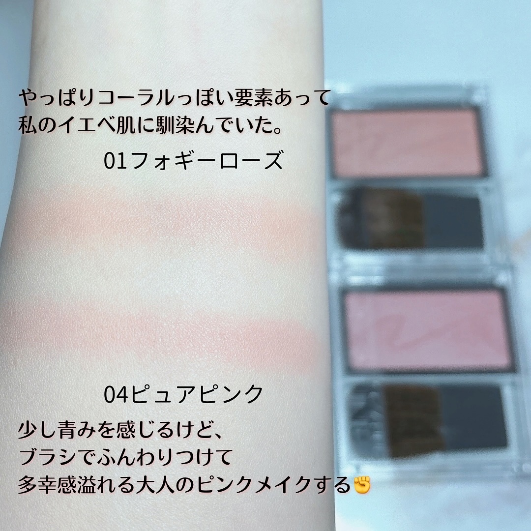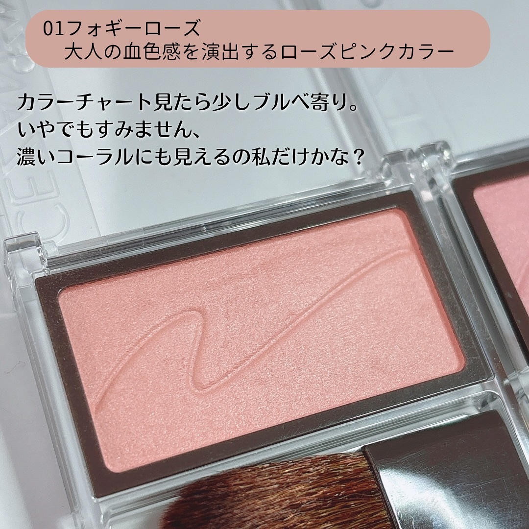溶け込むような質感のパウダーチーク。 しっとりとお肌に密着してなめらかな肌あたり。 「01 フォギーローズ」はくすみ感のあるローズピンク。 儚さと血色感をソフトにプラスして、上品な仕上がりがかわいい💕 この使い心地で550円のプチプラに感動。 このシリーズは2色めの購入なんだけど、全色欲しくなっている🥹