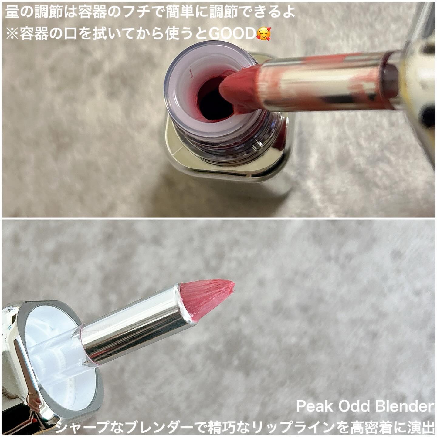 ブラシが結構珍しい形をしていてシャープなブレンダーで精巧なリップラインにもティントを綺麗に塗り広げて密着させてくれます♩ 塗った瞬間に唇が包まれるような潤い感でライトなカラーで仕上る鮮やかさが他にない🫶 ガラスのような繊細なツヤ感と発色がめっちゃきれいです✨