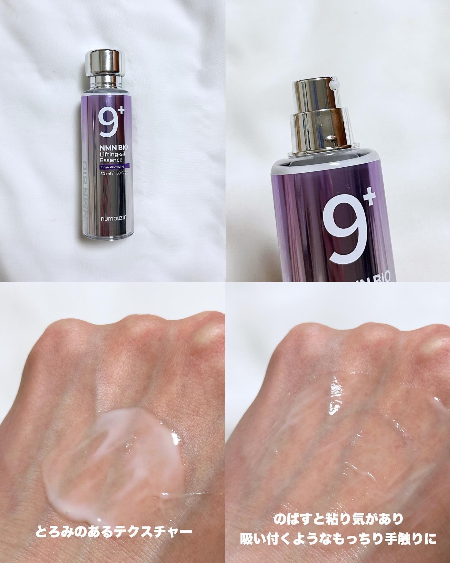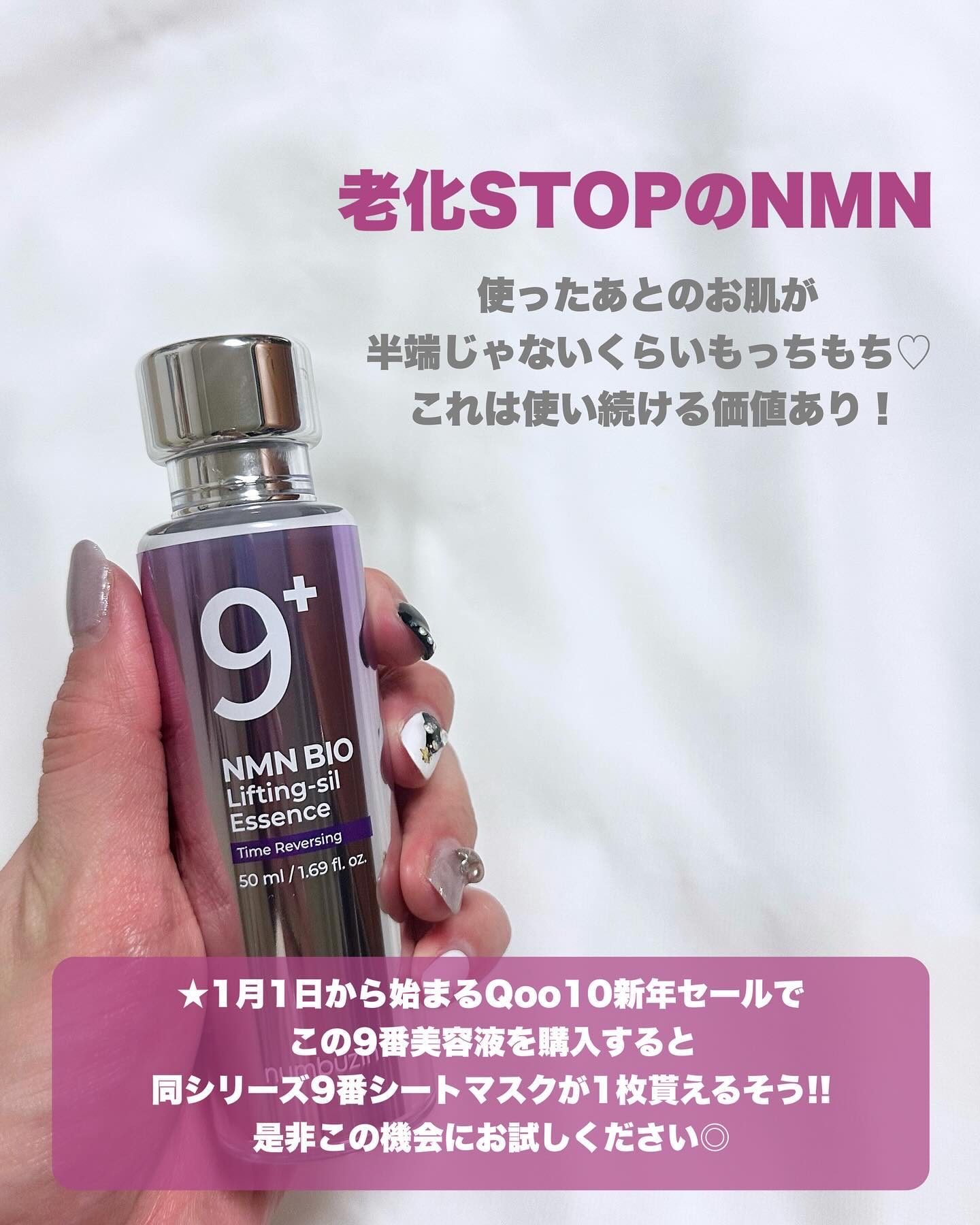 老化を遅らせる成分NMN! 皮膚の老化防止にはスキンケアでNMNを肌に塗って浸透させることが効果的という研究結果も! こちらの美容液の特徴はなんといっても伸びる糸リフトテクスチャー。 びよーんと伸びるまさに塗る糸リフトのような美容液でぴたっと肌に密着し、ぐいっと引き上げてくれるような使い心地の美容液です。 NMN BIOがたるみ毛穴やほうれい線にアプローチしてくれます✨ 1/1(水)~1/7(火)のQoo10新年セールで、こちらの9番美容液を買うと9番シートマスク1枚がついてくるお得なイベントも開催されます!