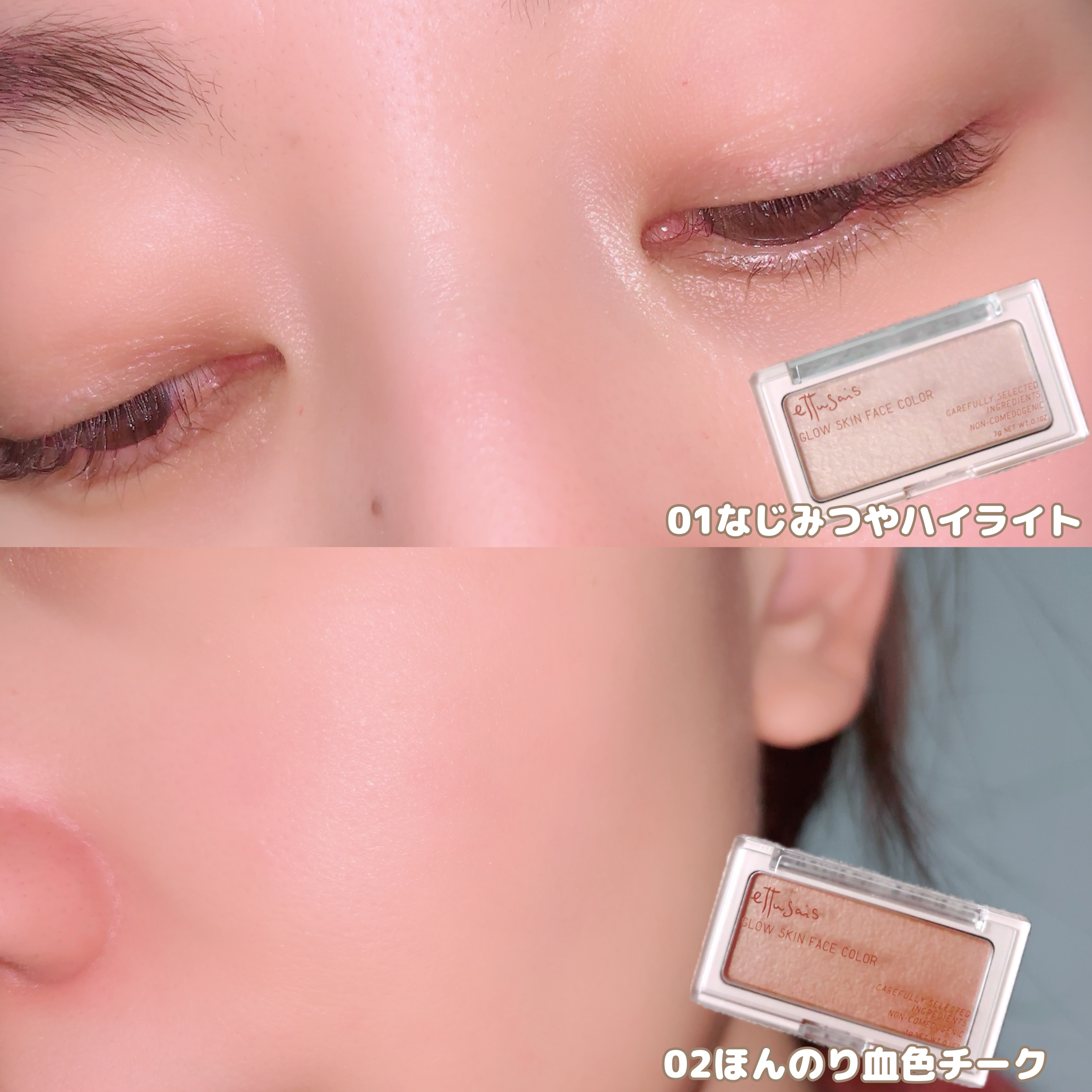 エテュセのフェイスカラー、待ってましたー!! もうね、ほんとうに使用感がよかった✨ うるおいが長時間続くスキンケア仕立てでテクスチャーだけでなく肌もしっとりが続く🫧 01 なじみつやハイライト 繊細な輝きでうるおったツヤ肌を演出 白浮しないピンクベージュ♡