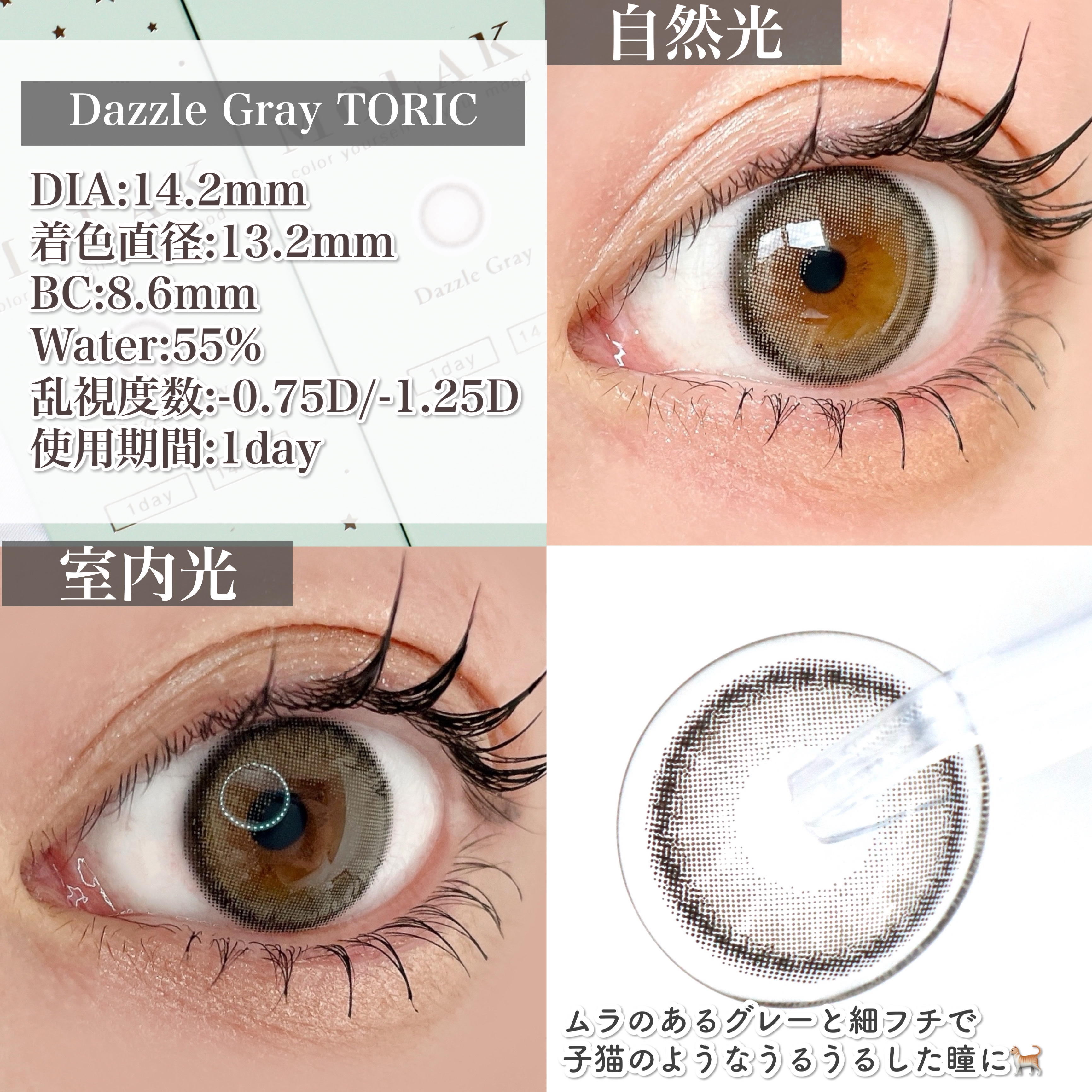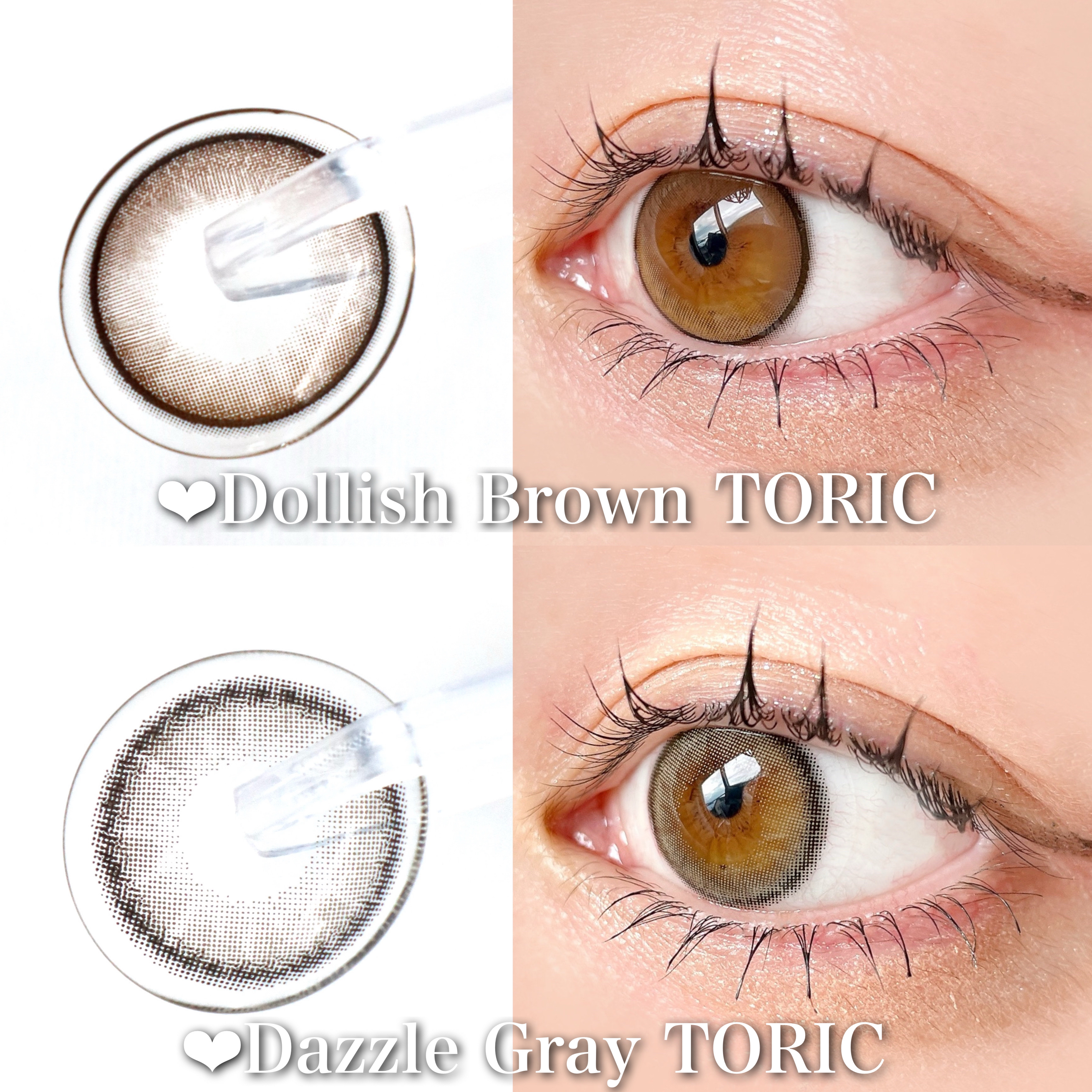 通常のドーリッシュブラウンより落ち着いた発色♡体感大きめで盛れる水光カラコンです! 裸眼と変わらないサイズで色味だけを変えられるから、小さめカラコンが好きな方グレーカラコンが好きな方におすすめ! どちらもとても可愛いので乱視の方是非チェックしてみてください〜〜!!🎀
