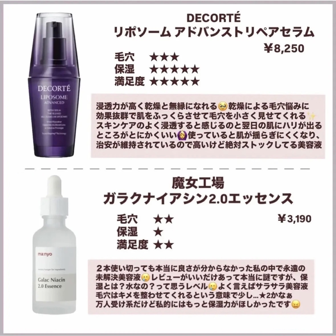 毛穴に打ち勝つおすすめ美容液紹介します🐰 朝夜で1個ずつ買いましょう! おすすめは朝ビタ.夜レチです! 美容液1つでも使うのと使わないのとでは違ってくるので自分に合う商品に出会えるように色々と試してみてくださいね🥹