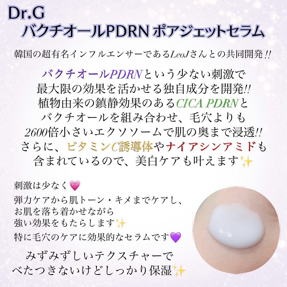 韓国の有名インフルエンサー LeoJ との共同開発✨️ 弾力ケアから肌トーン、キメまでケアし、特に毛穴のケアに効果的なセラム! 「バクチオールPDRN」という、少ない刺激で最大限の効果を活かせる独自成分を開発😳 睡眠不足・肌ストレスにも疲れを感じさせない透明感のあるツヤ肌に😍