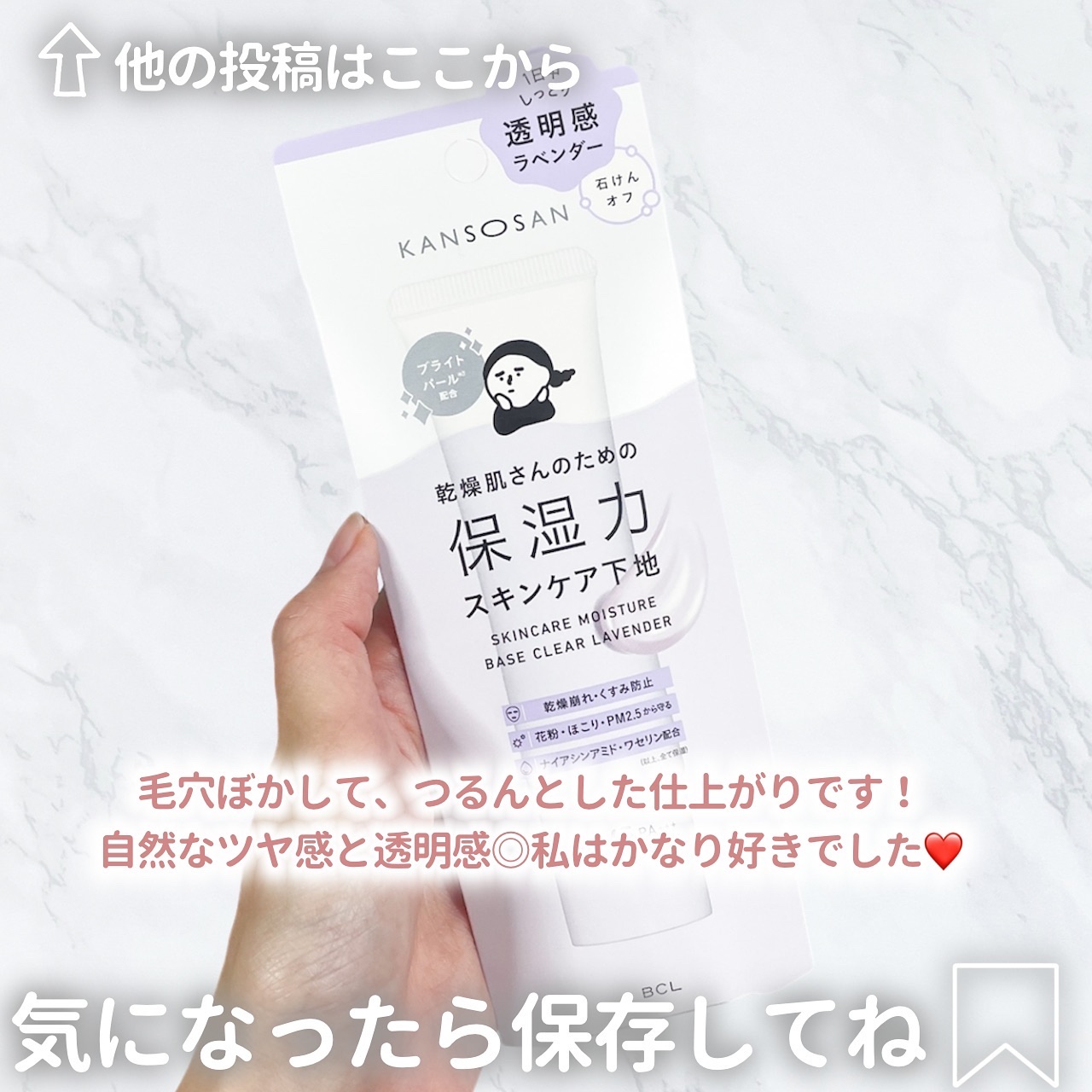 乾燥さん保湿力スキンケア下地 透明感ラベンダーを購入しました。こちらはラベンダーの下地で塗るとほんのり肌がトーンアップします。 テクスチャは伸びが良くて肌馴染みも良く肌がしっとりします。カバー力はないです。 SPF45 PA +++でUV効果も高く夏でも使用できそうです。