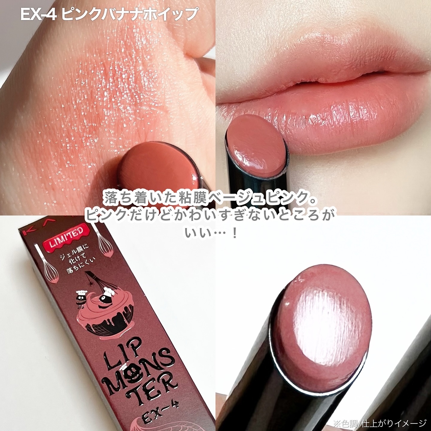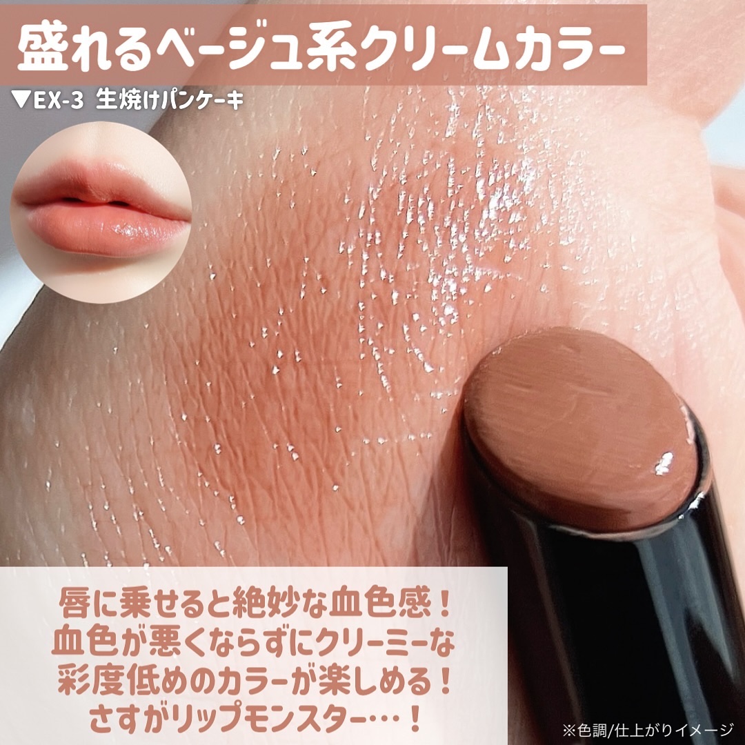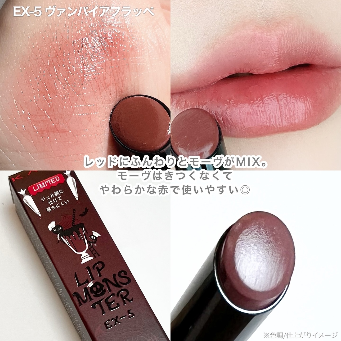 - 落ちにくさも美発色もよくばりたい、つけたての色が長時間持続する人気の口紅リップモンスター。 唇から蒸発する水分を活用して密着ジェル膜に変化する独自技術※で、つけたての色が長時間持続。 高発色&保湿。 ※当社独自の色持ち技術 ■花火のようにまぶしくきらめく 繊細なラメが際立つ限定色 EX-6 ピンクカラー×青ラメ【ロケット花火流星群】 EX-7 オレンジカラー×黄&緑ラメ【100万発の線香花火】 EX-8 レッドカラー×緑ラメ【打ち上げ花火ブランコ】 ■深みレッド系カラーの限定色 EX-9 戦慄の喜笑 (限定色) EX-10 狂気の怒号 (限定色) 【2025クリスマスコフレ】 落ちにくいリップモンスターから、唇の血色感を底上げする ホリデーシーズン限定の熱感ニュアンスベージュ系カラー登場。 EX-11 紅煙宿る贈り物(限定色):ボルドーベージュ系 EX-12 盗まれた1224mの星光(限定色):キャメルベージュ系