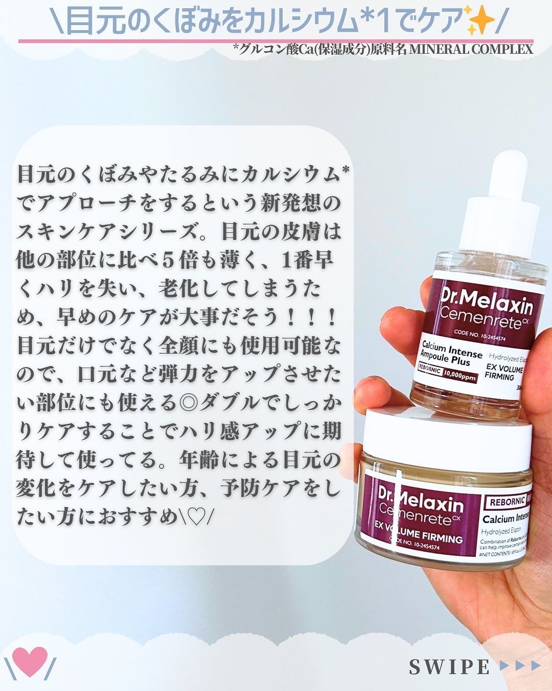 コラーゲンだけじゃ物足りない💔 カルシウムも欲しいっ🦴 目元のくぼみやハリ不足って老けて見えるよね? くぼんだ目元肌に必要なのは、カルシウム💫 トロっとしたアンプルと柔らかいクリームでどっちも優しく肌に馴染む感じ🥰
